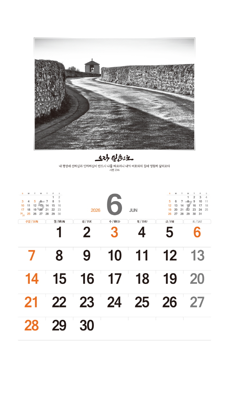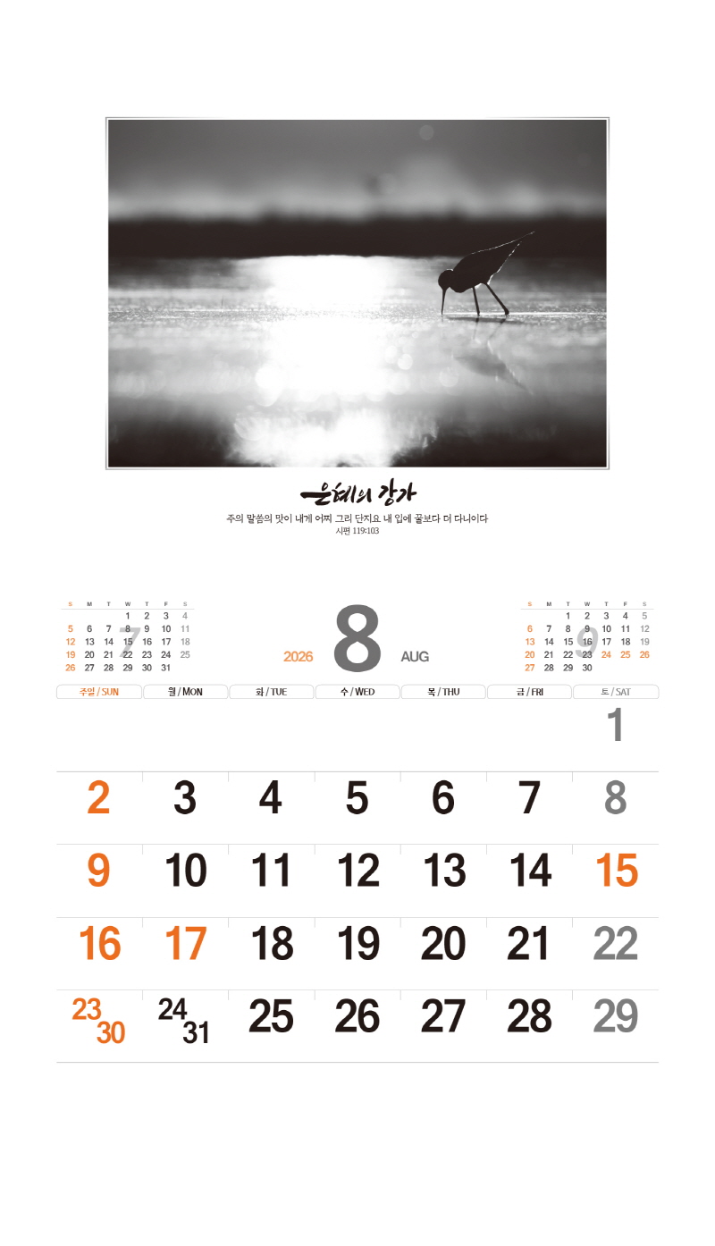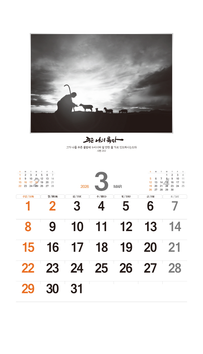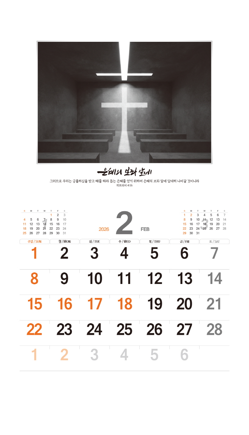 본 캘린더에는 음력, 절후, 교회력이 표기되어 있습니다.