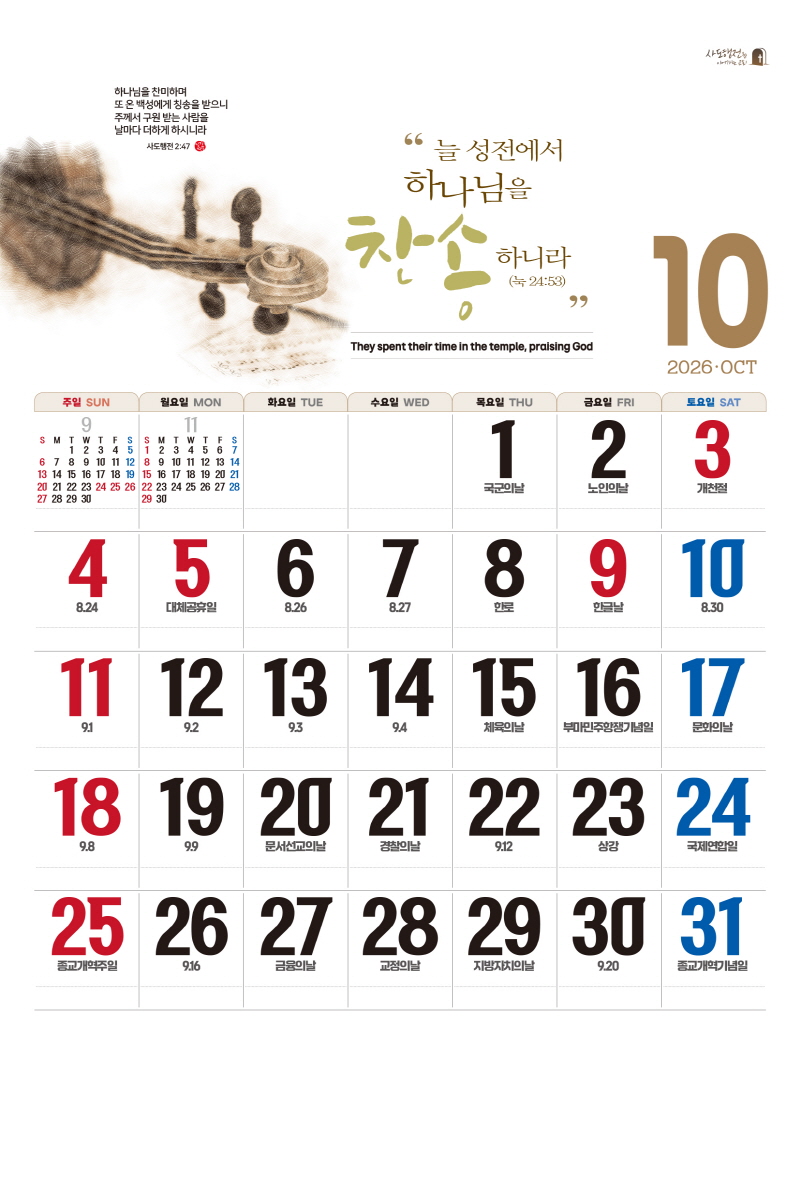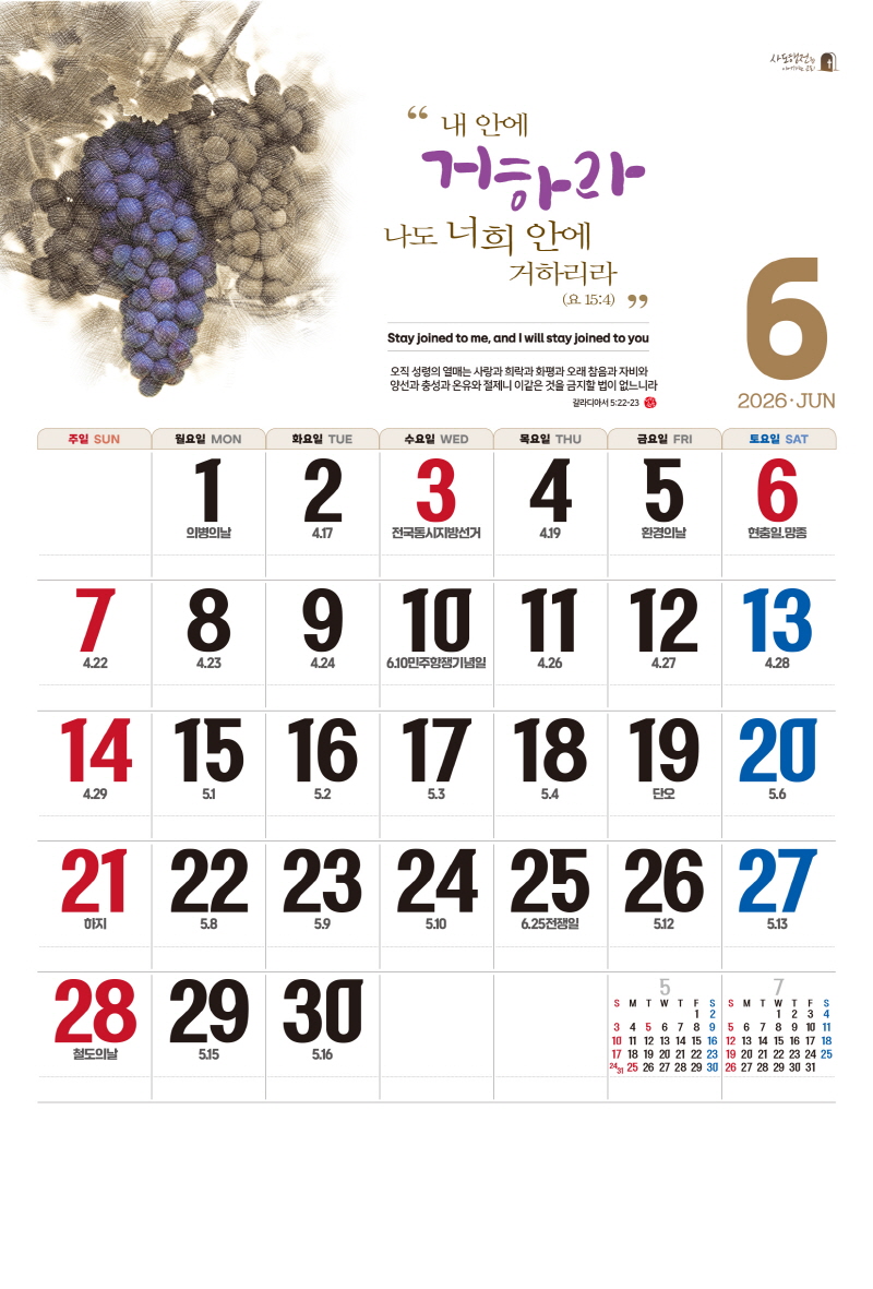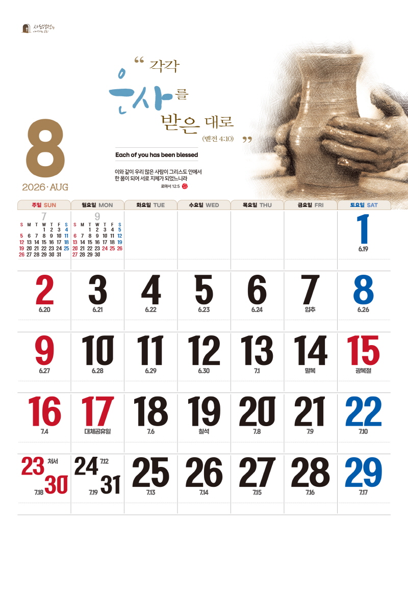본 캘린더에는 음력, 절후, 교회력이 표기되어 있습니다.