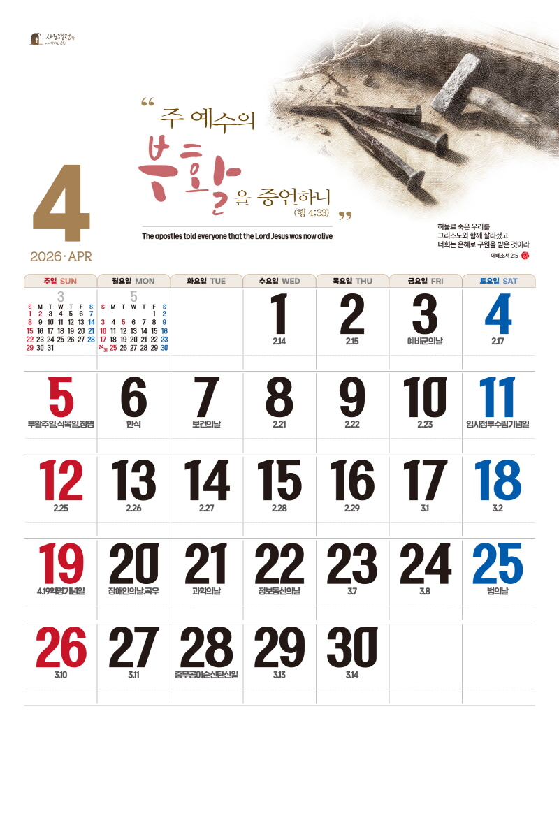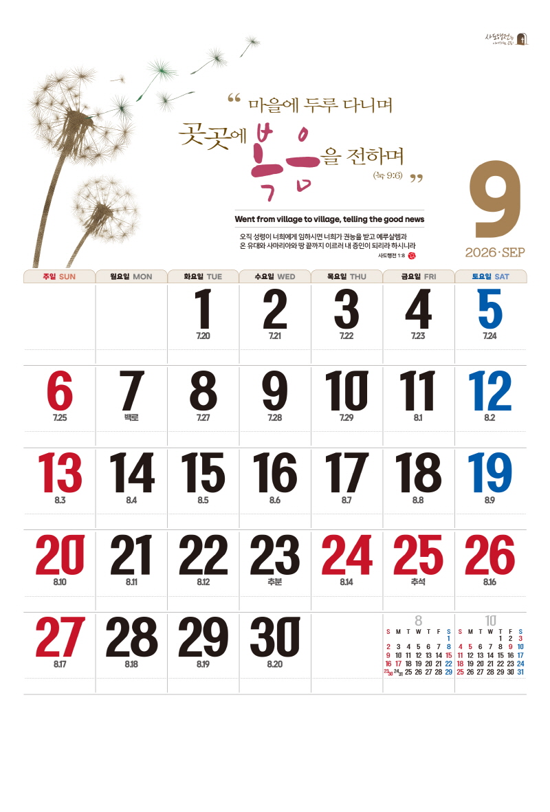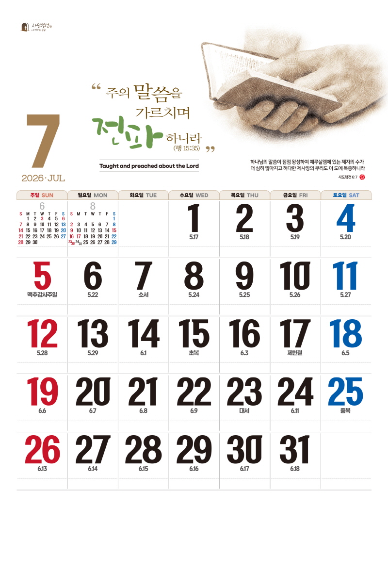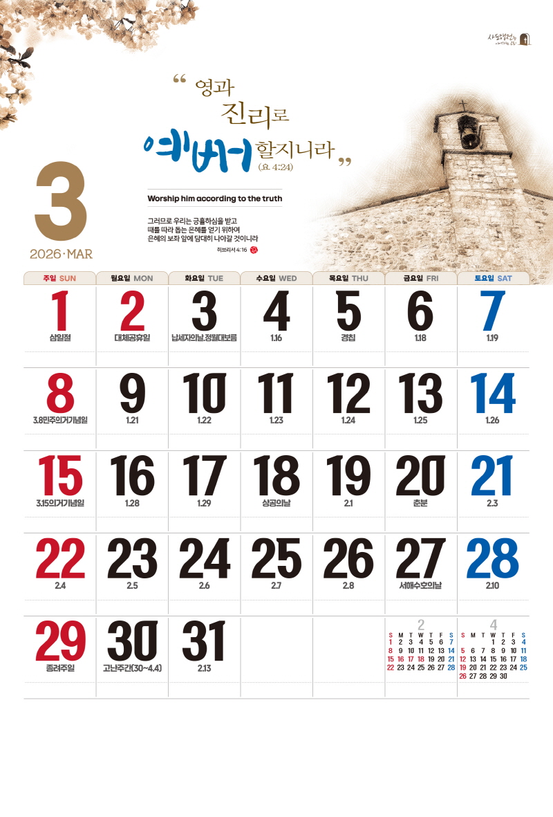 본 캘린더에는 음력, 절후, 교회력이 표기되어 있습니다.
