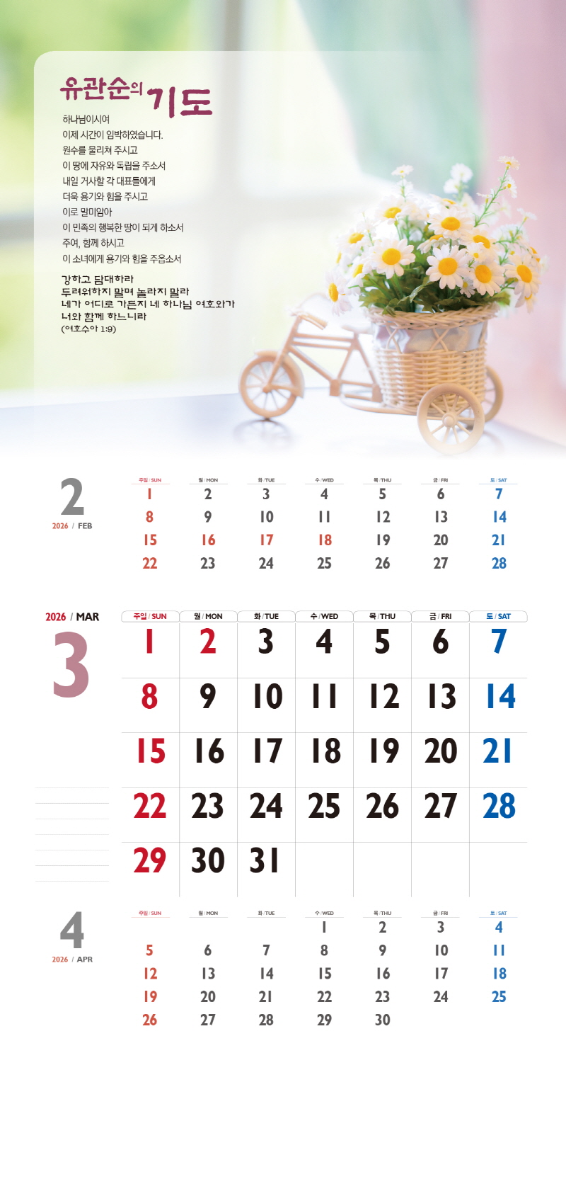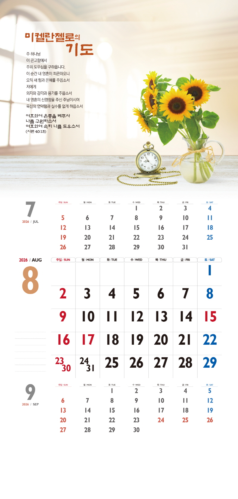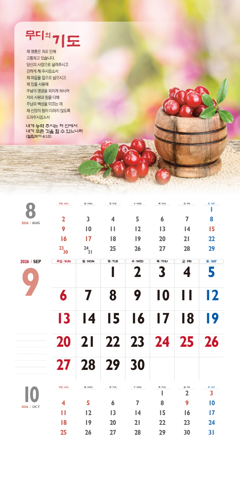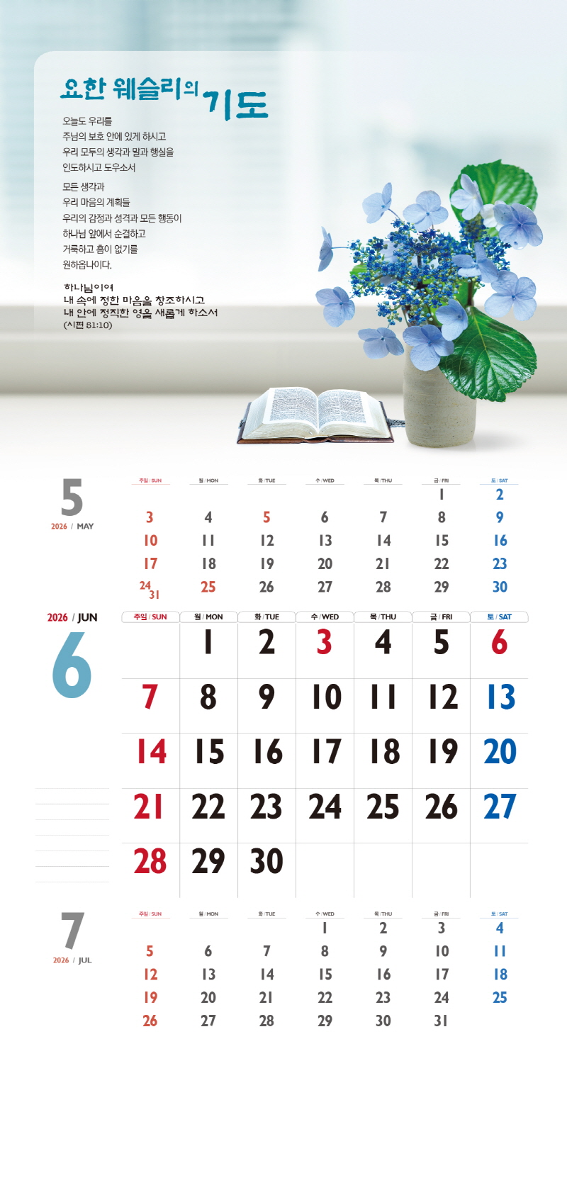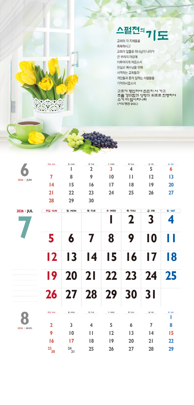 본 캘린더에는 음력, 절후, 교회력이 표기되어 있습니다.