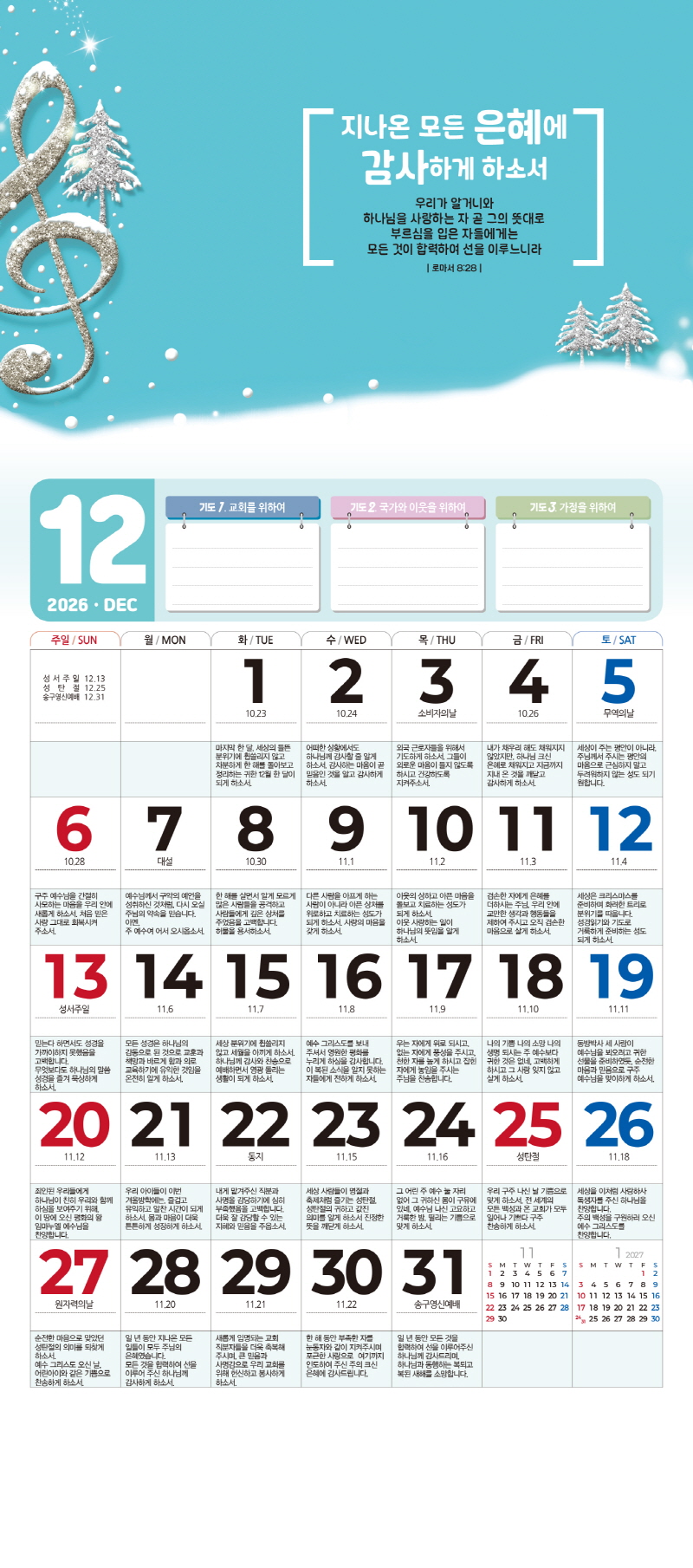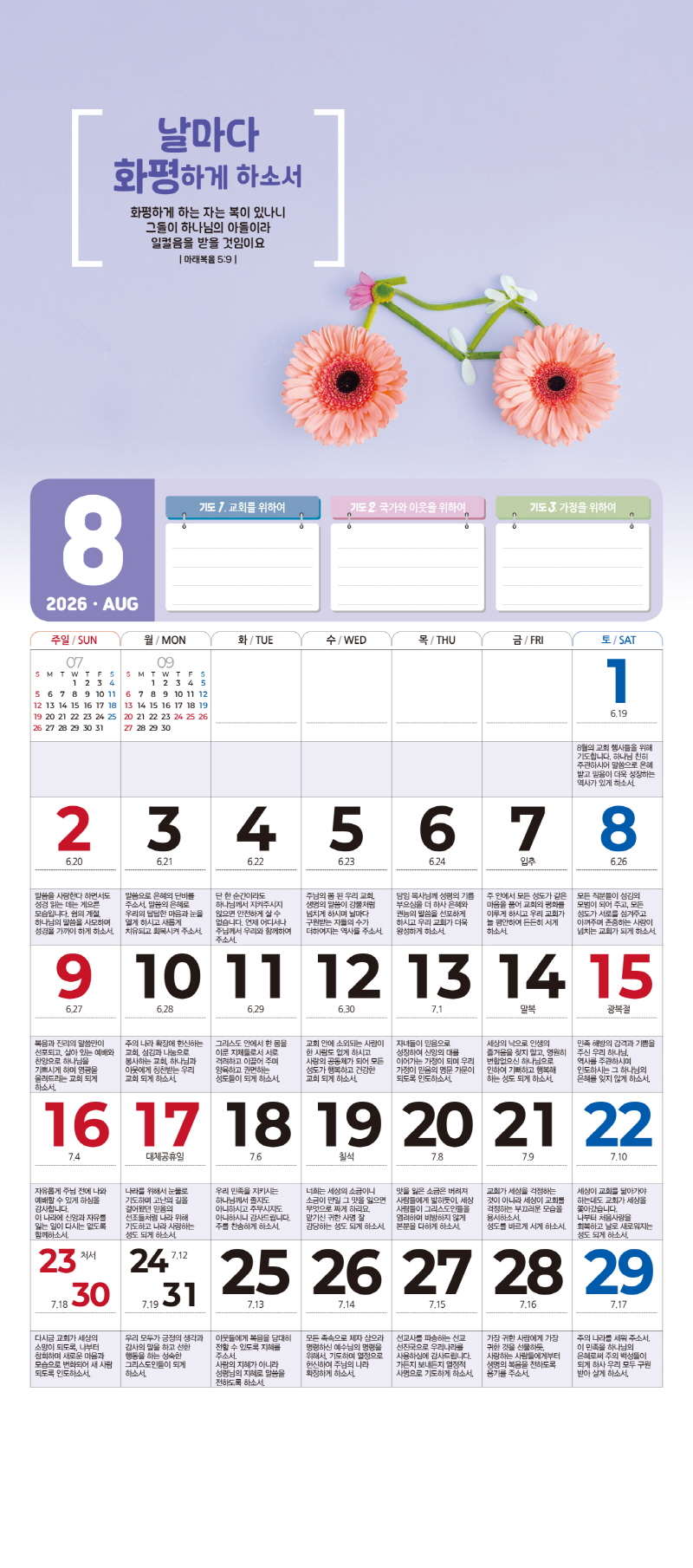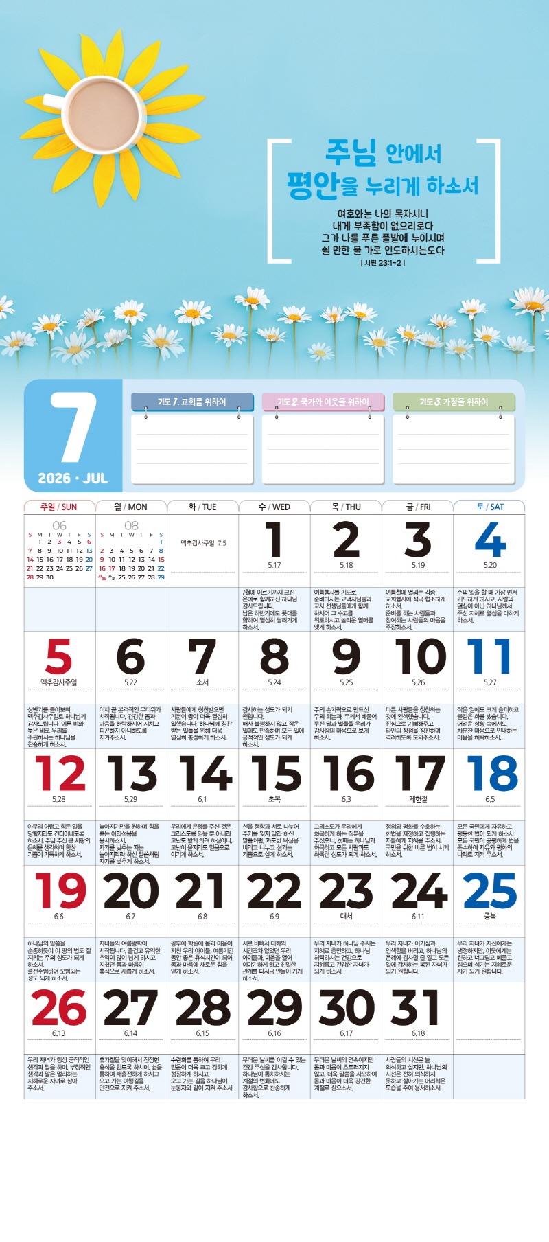 본 캘린더에는 음력, 절후, 교회력이 표기되어 있습니다.