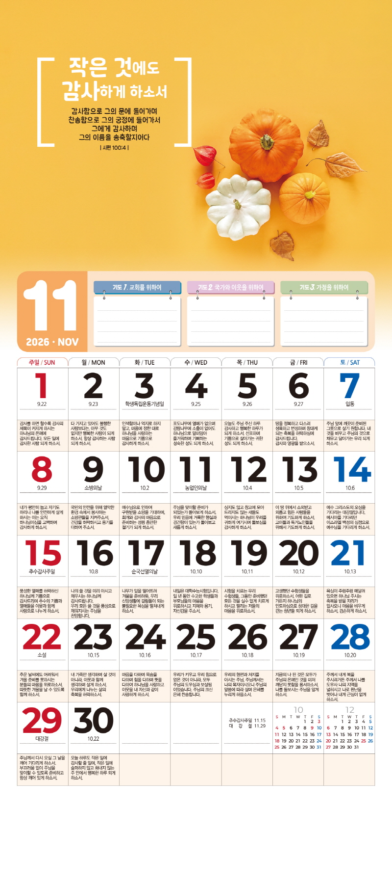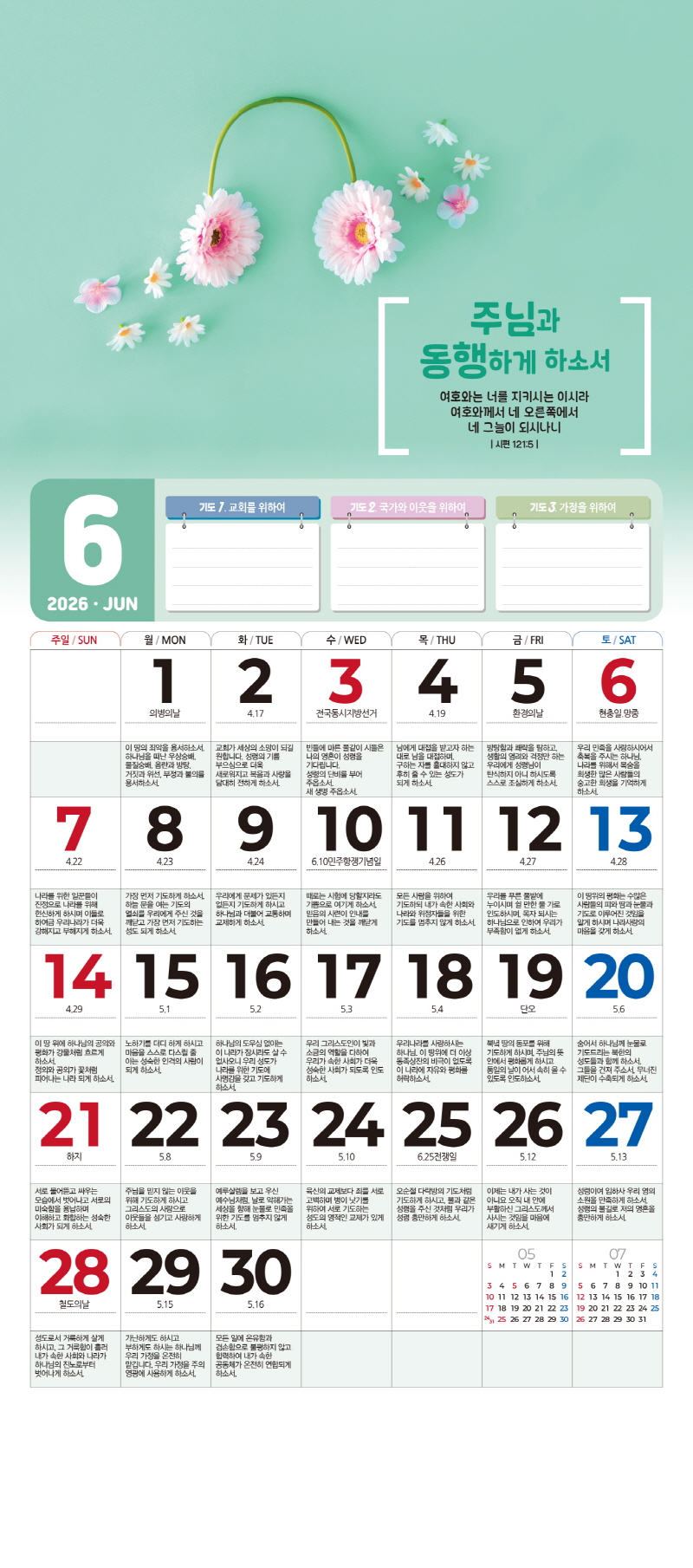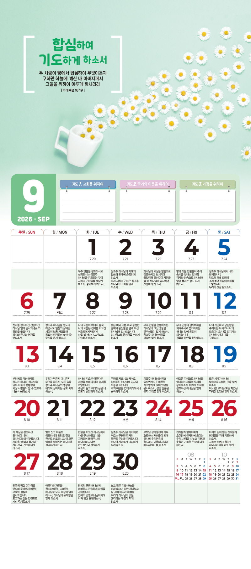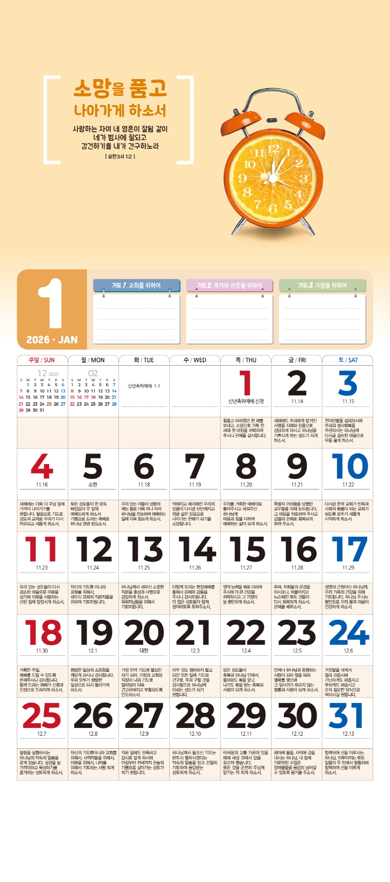 본 캘린더에는 음력, 절후, 교회력이 표기되어 있습니다.