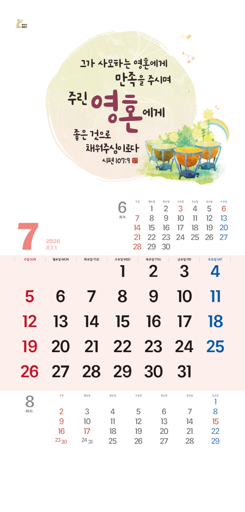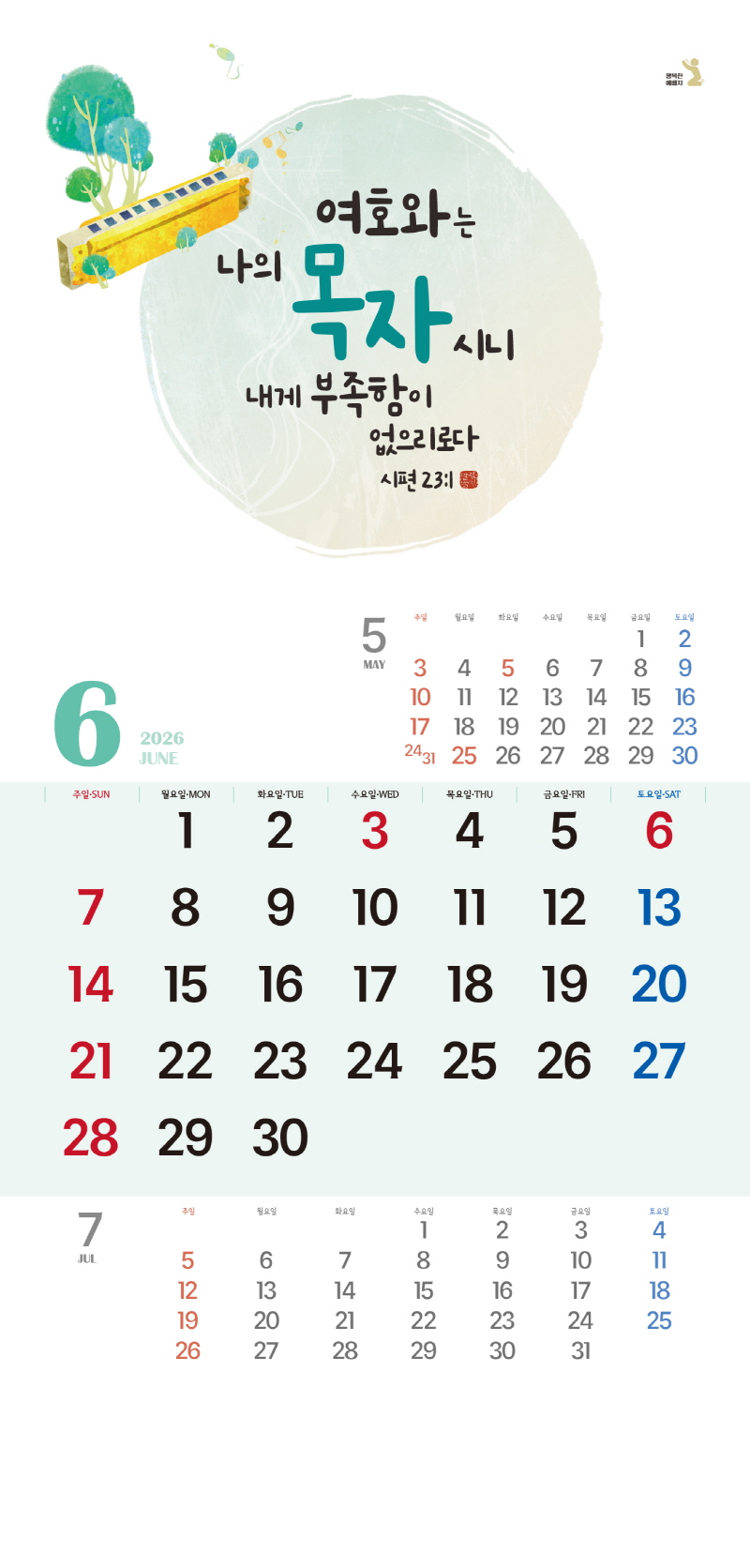 본 캘린더에는 음력, 절후, 교회력이 표기되어 있습니다.