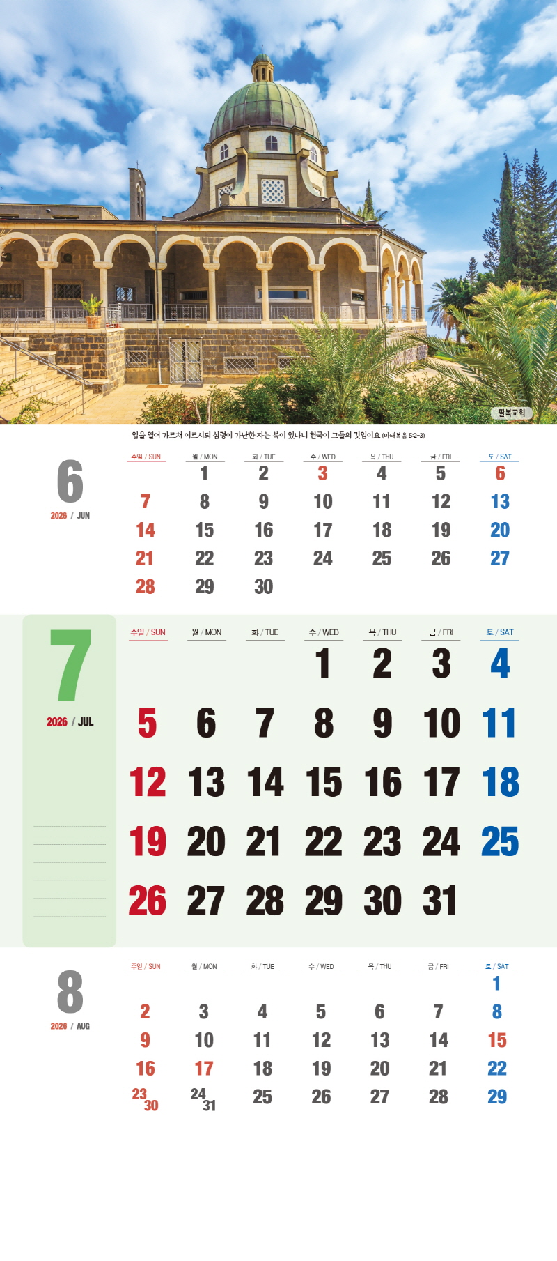 본 캘린더에는 음력, 절후, 교회력이 표기되어 있습니다.
