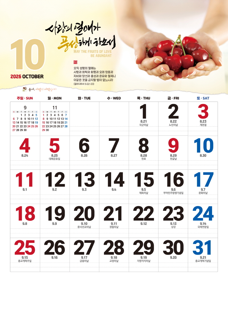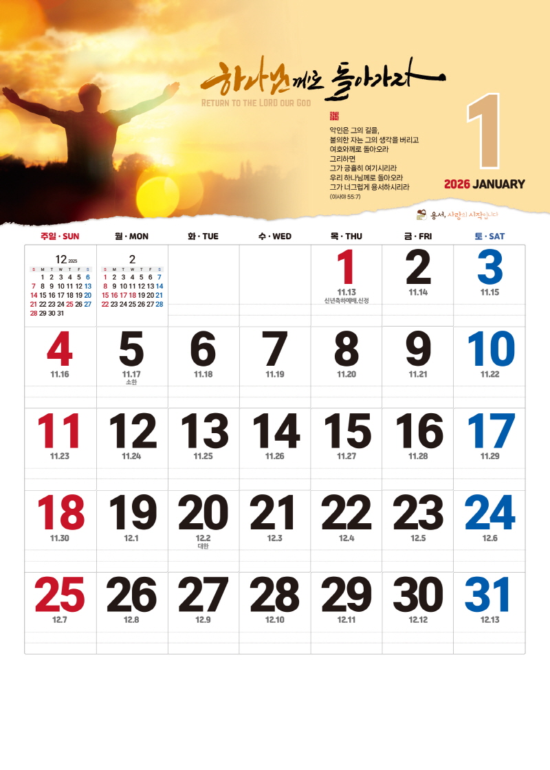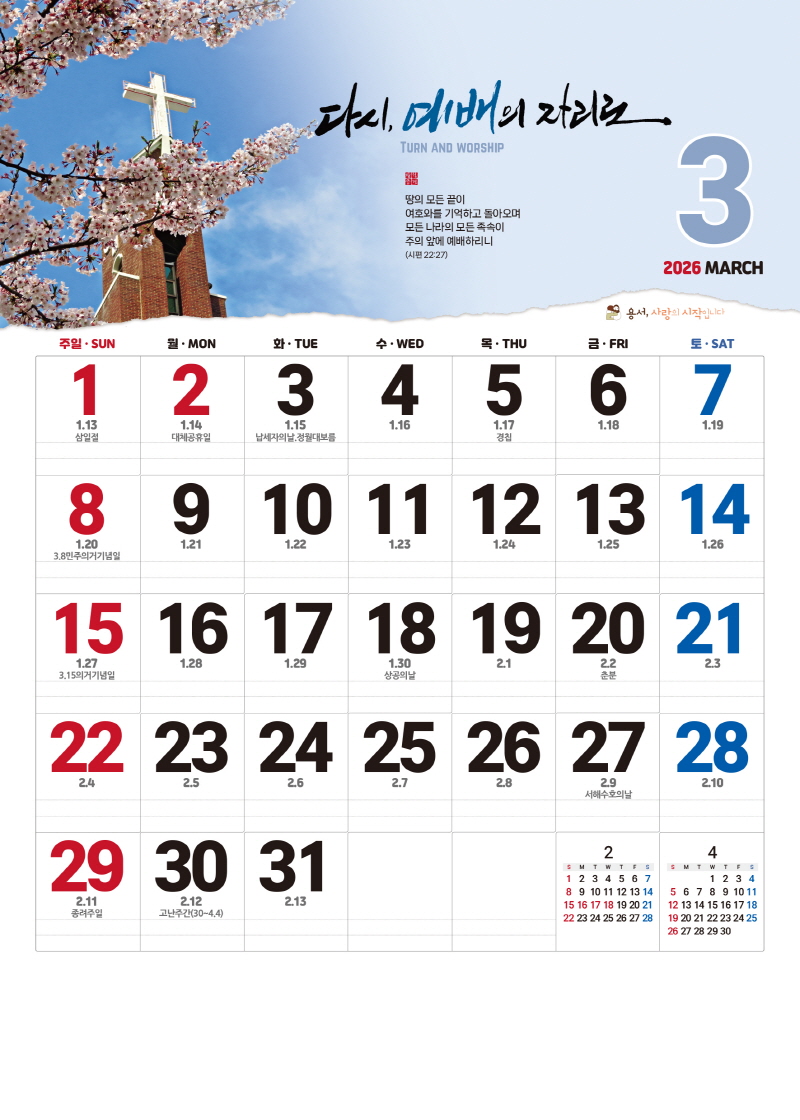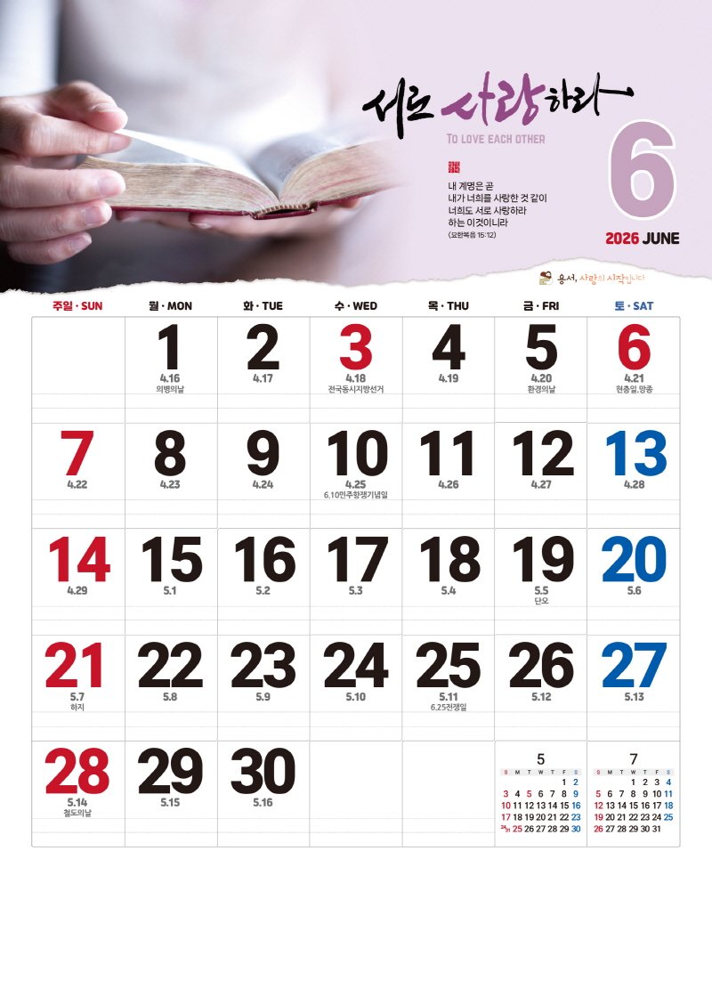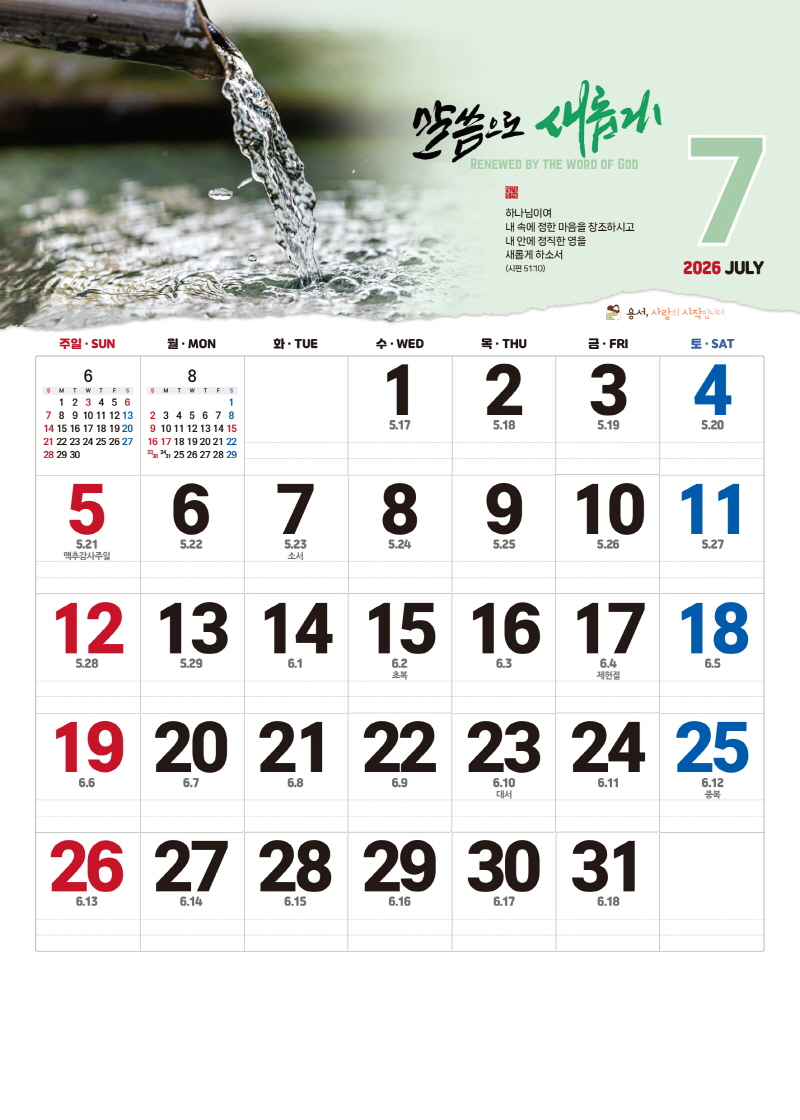 본 캘린더에는 음력, 절후, 교회력이 표기되어 있습니다.