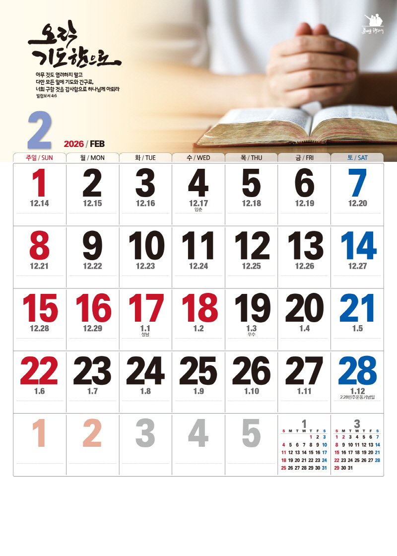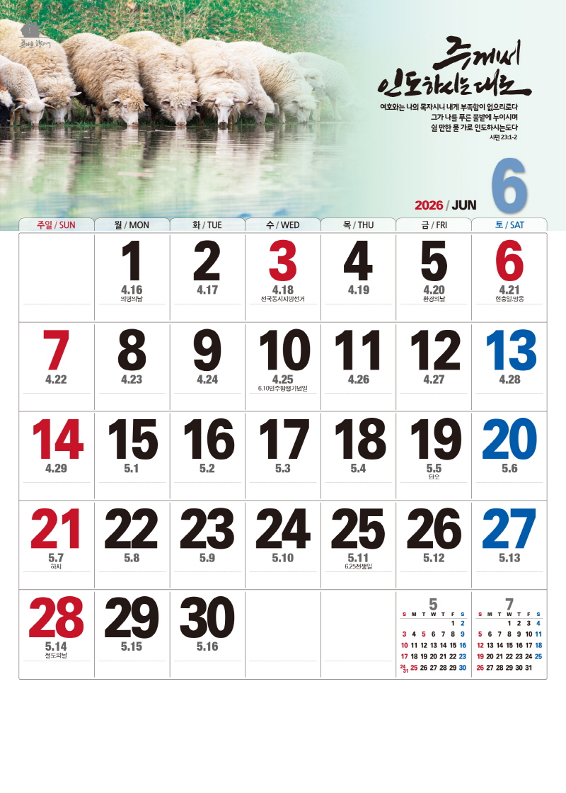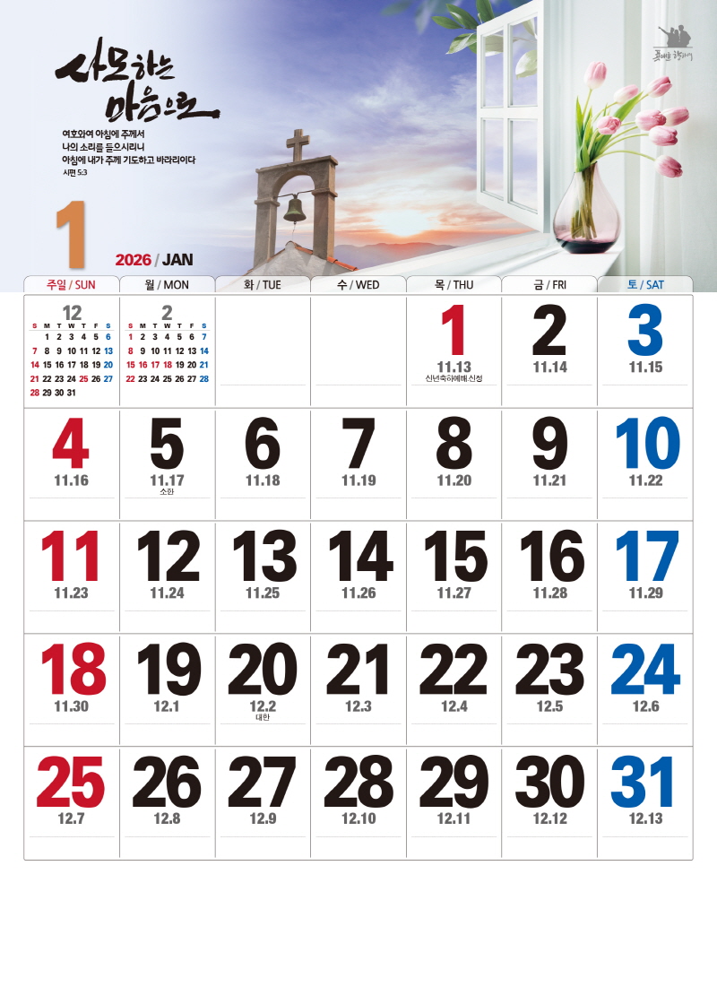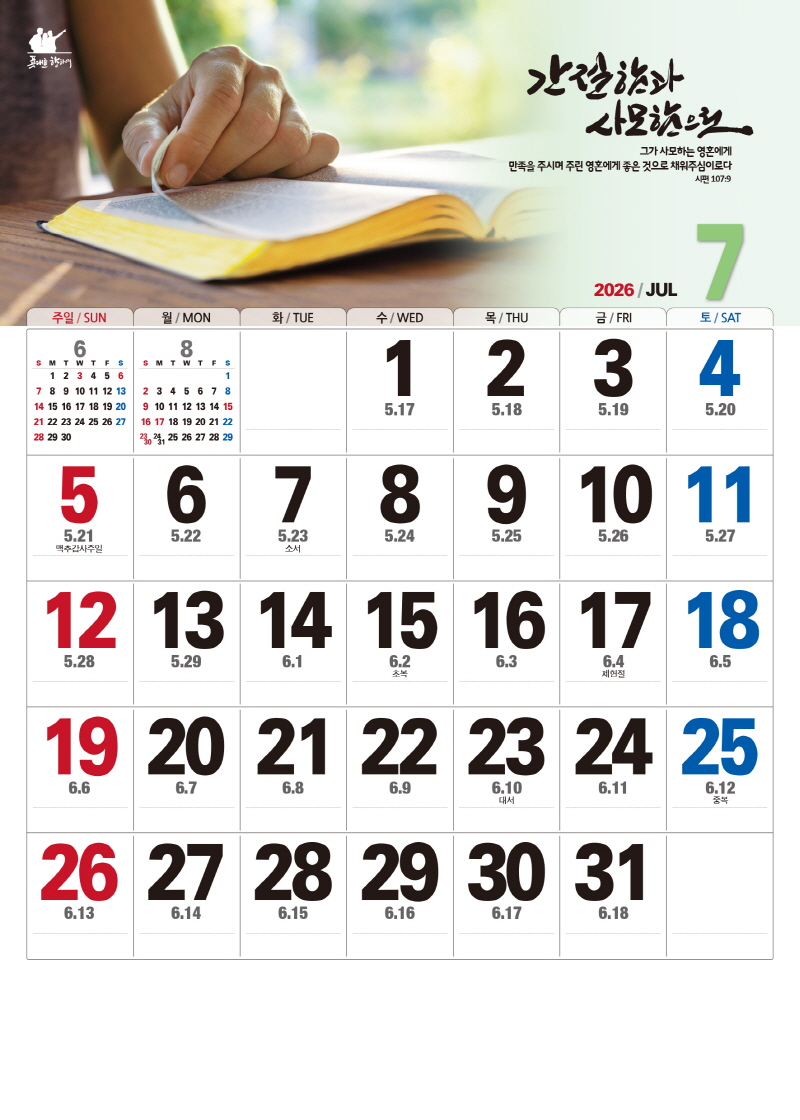 본 캘린더에는 음력, 절후, 교회력이 표기되어 있습니다.