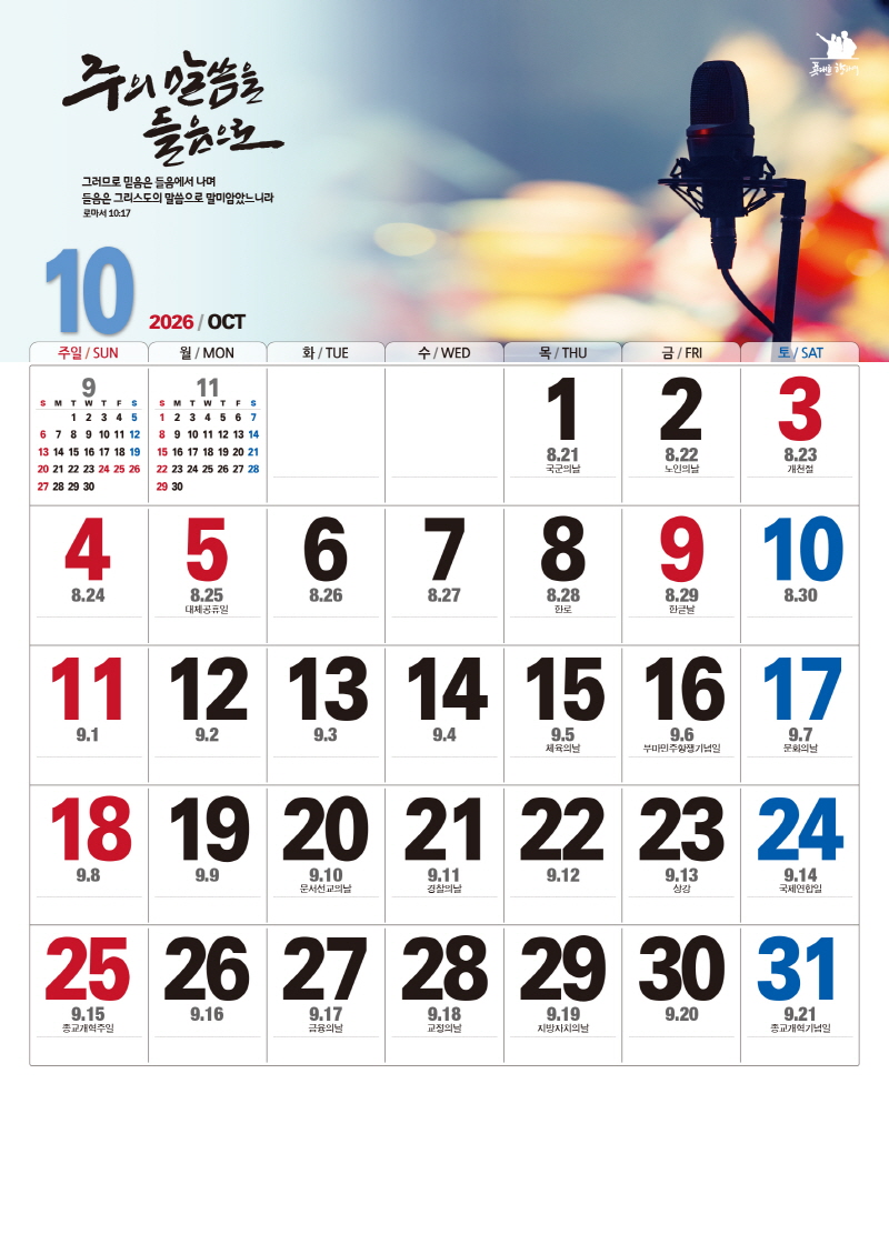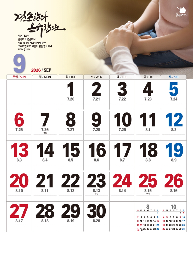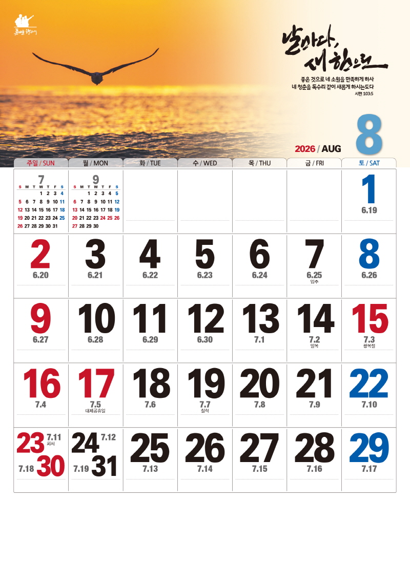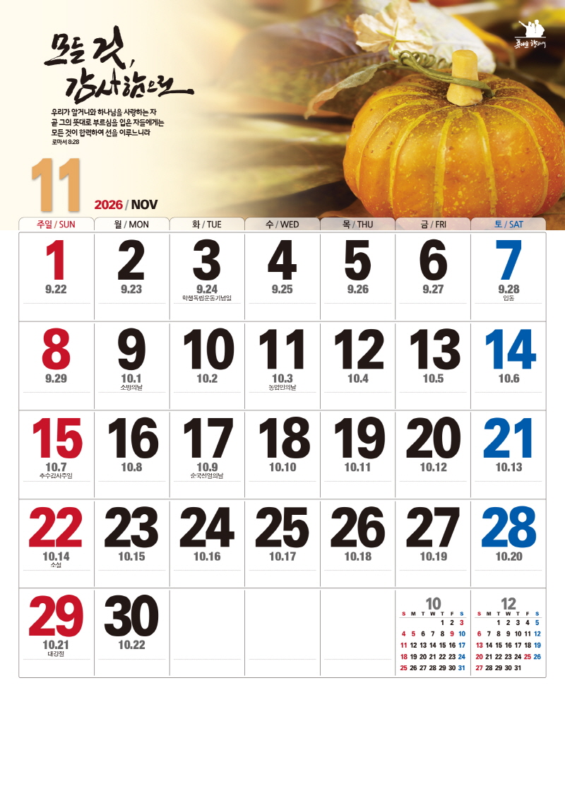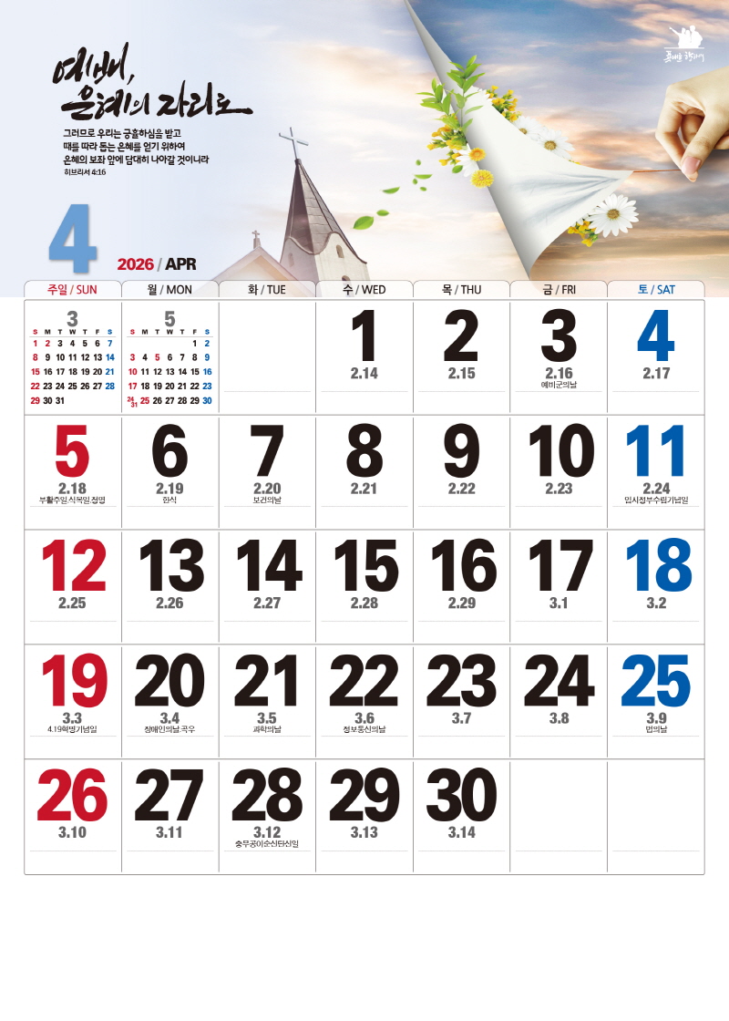본 캘린더에는 음력, 절후, 교회력이 표기되어 있습니다.