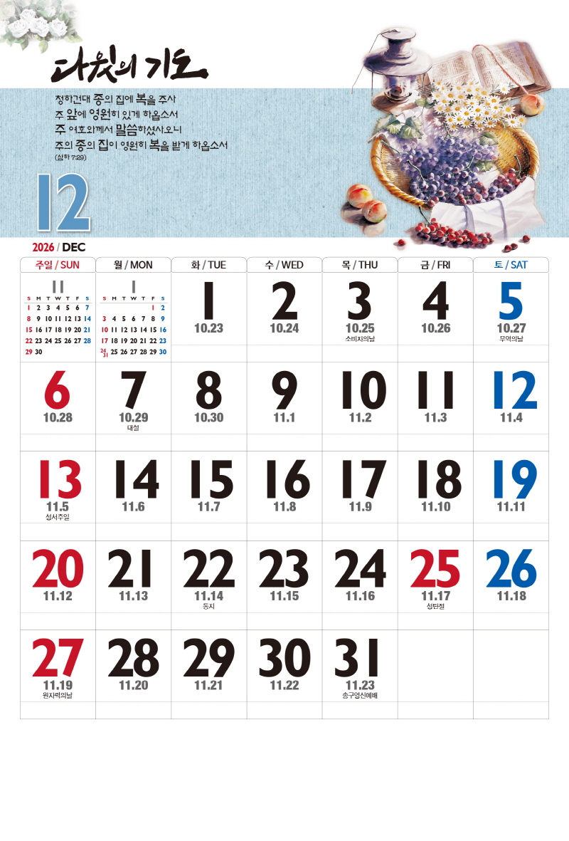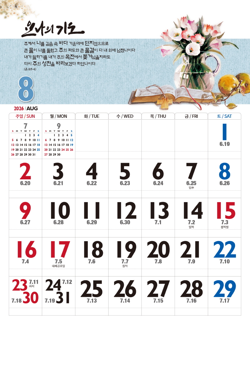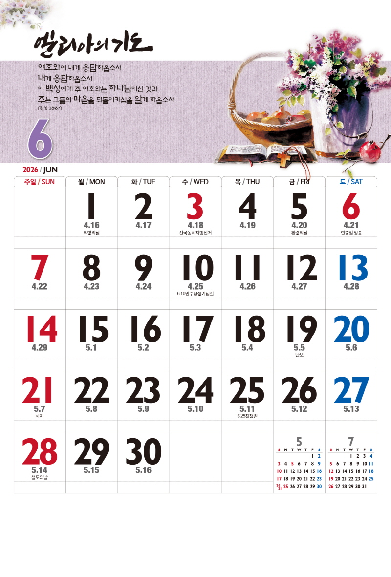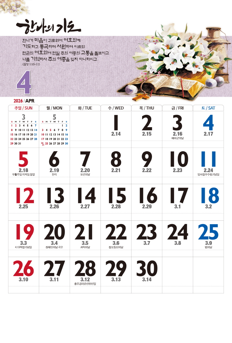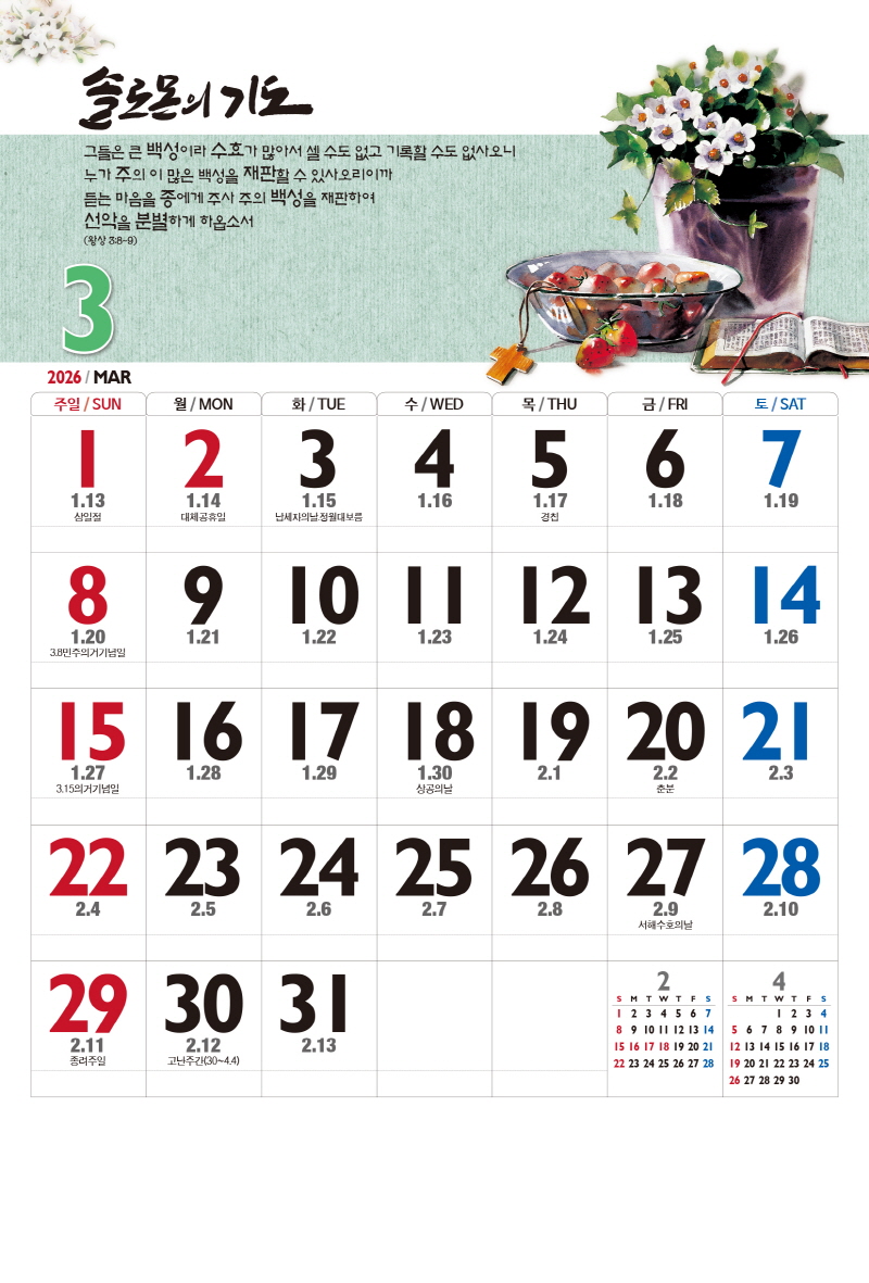 본 캘린더에는 음력, 절후, 교회력이 표기되어 있습니다.