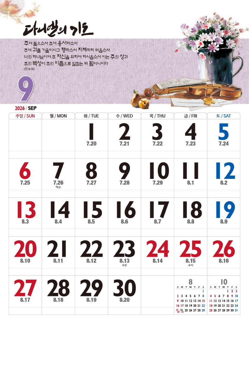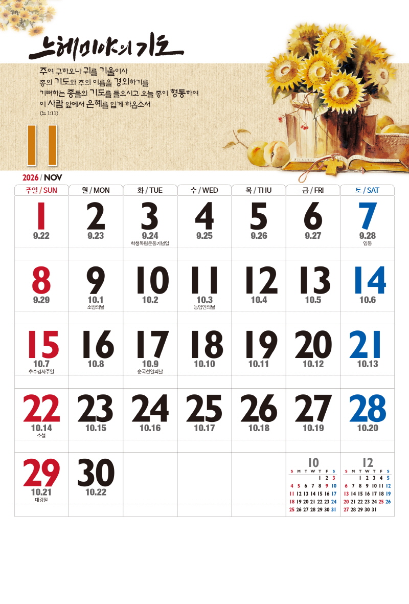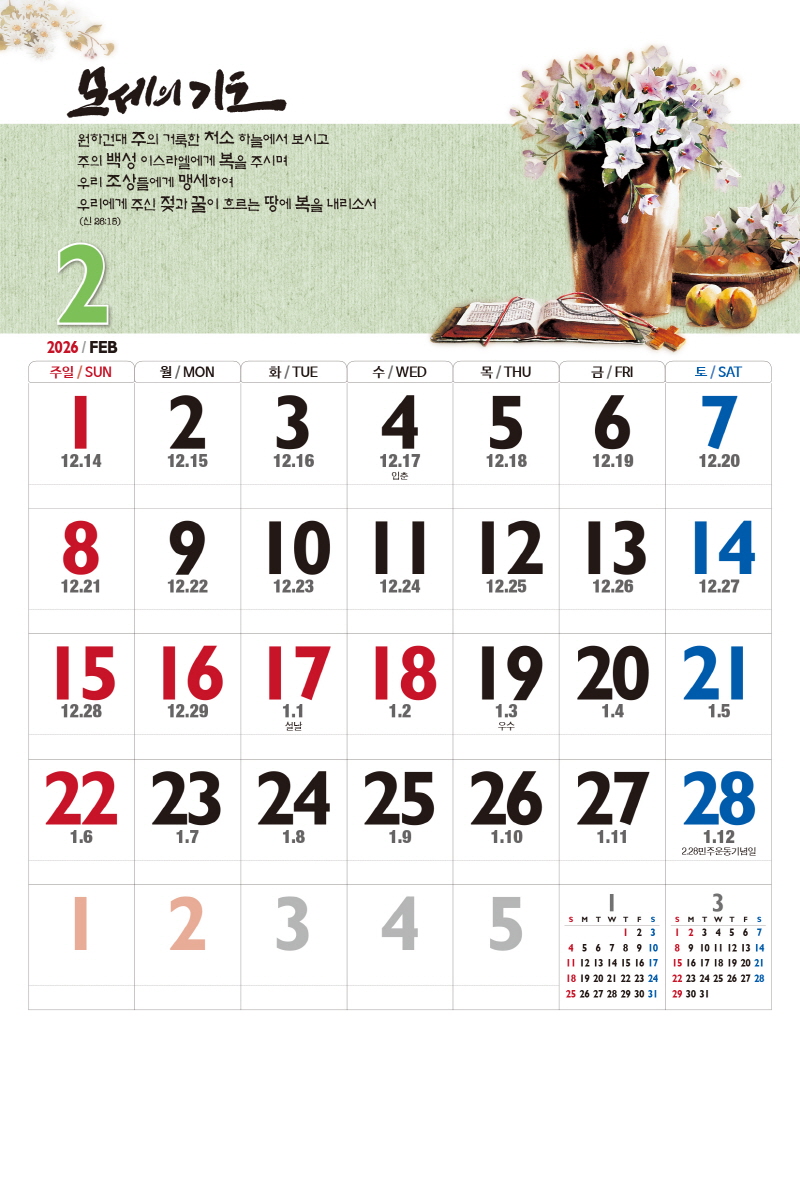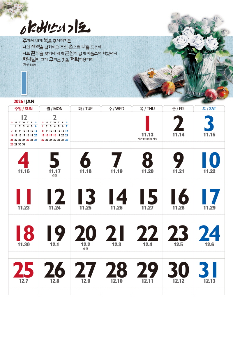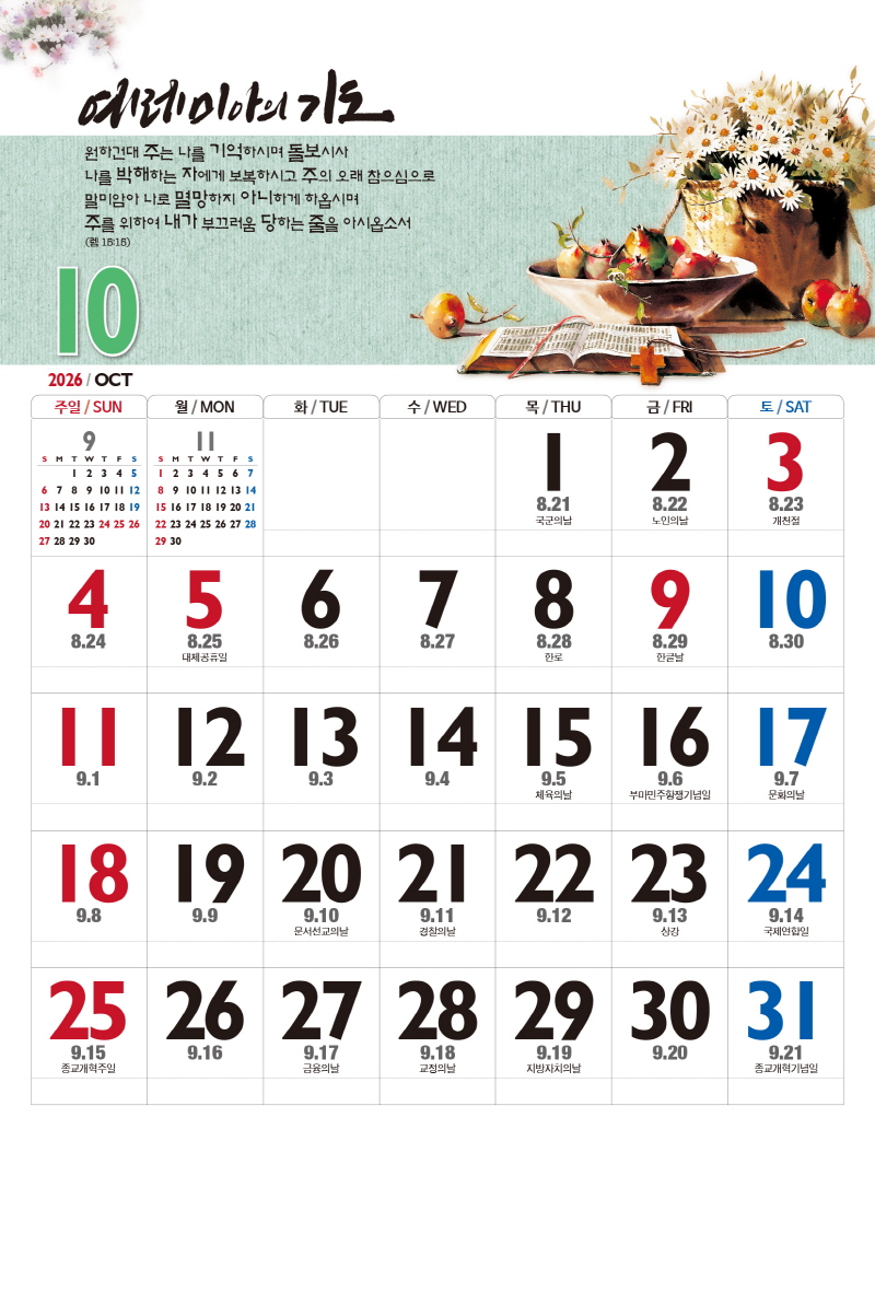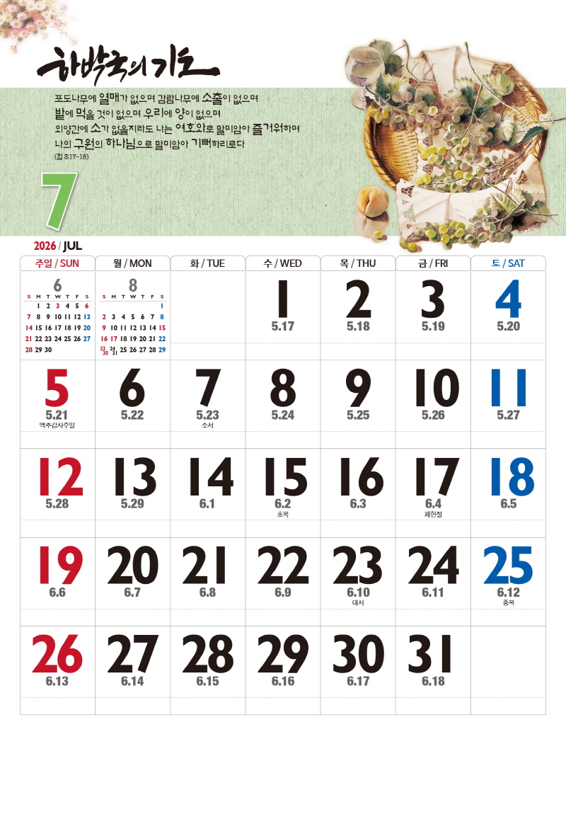 본 캘린더에는 음력, 절후, 교회력이 표기되어 있습니다.