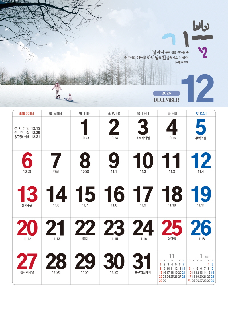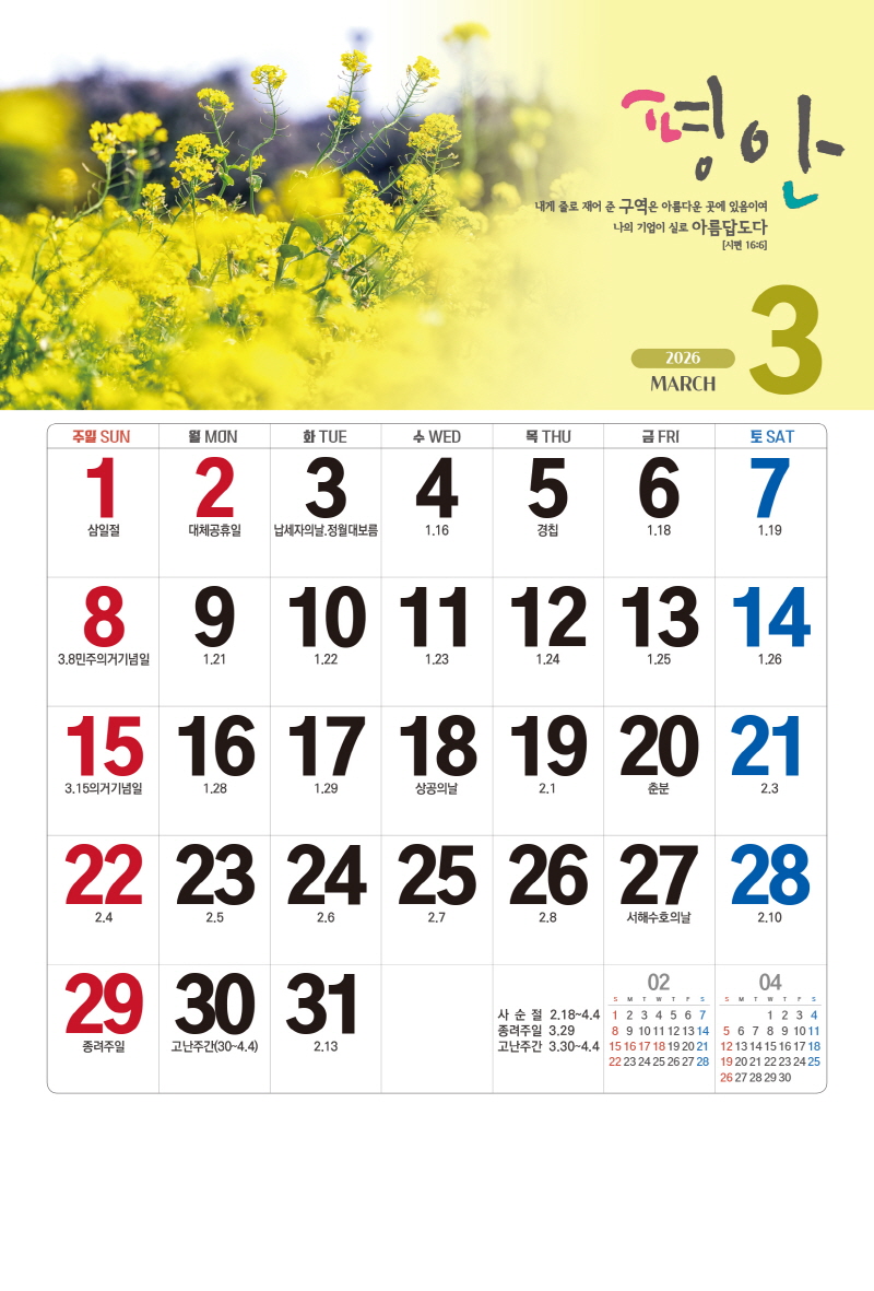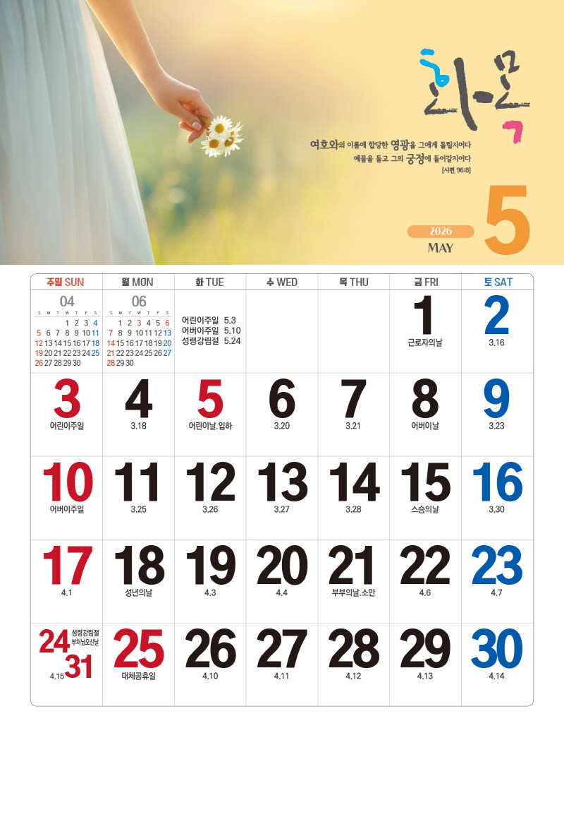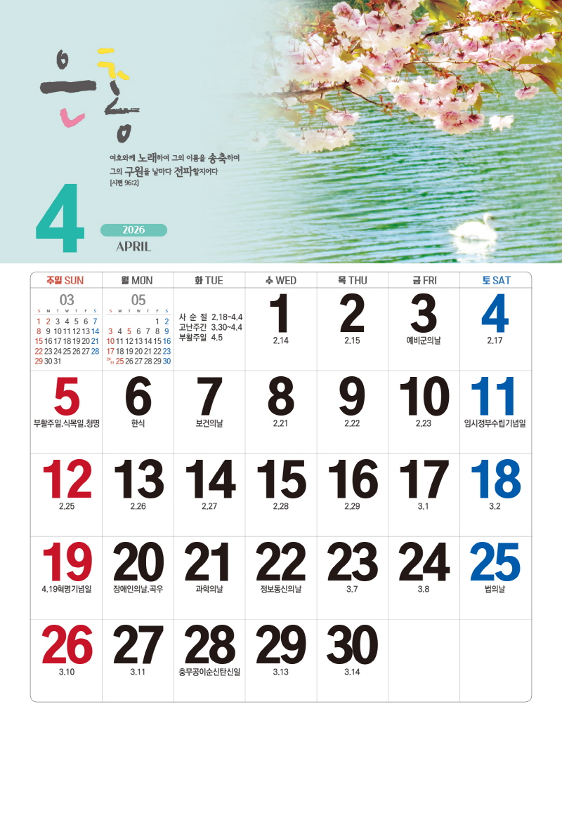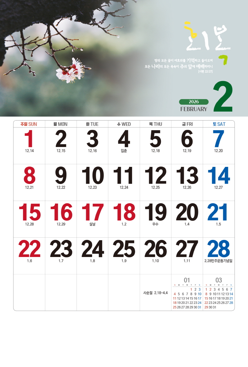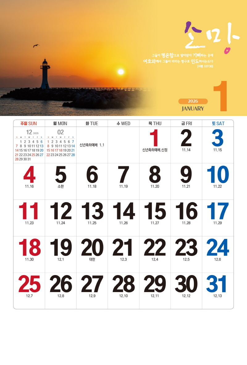 본 캘린더에는 음력, 절후, 교회력이 표기되어 있습니다.