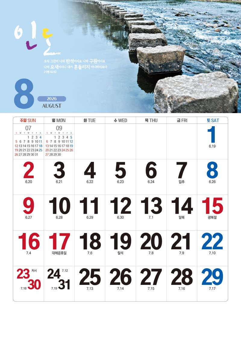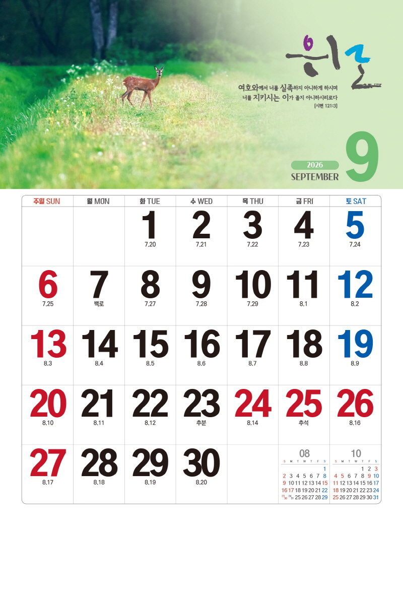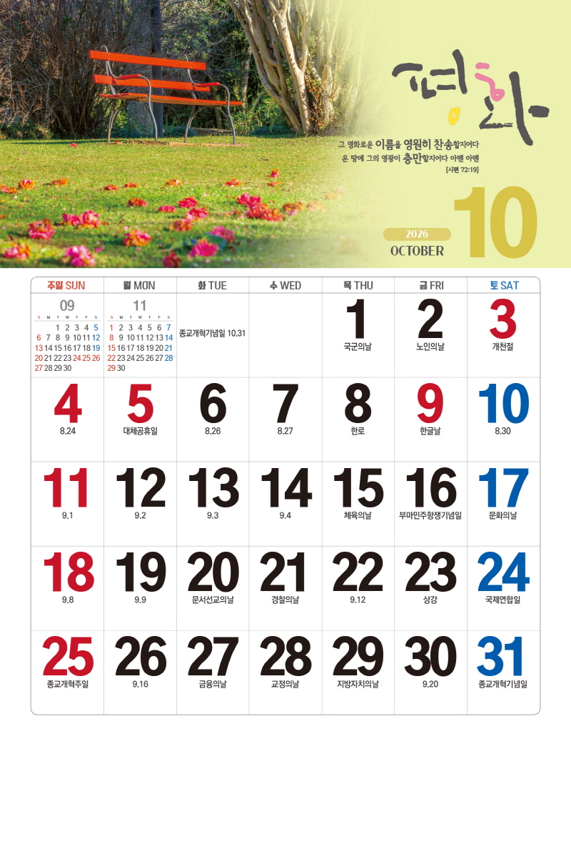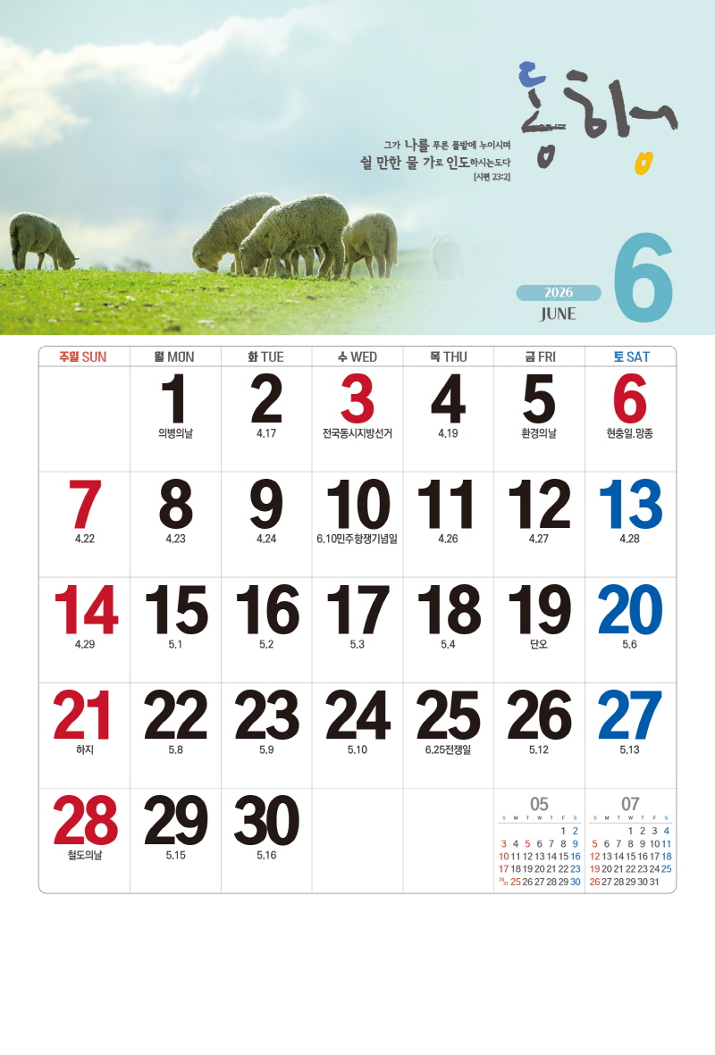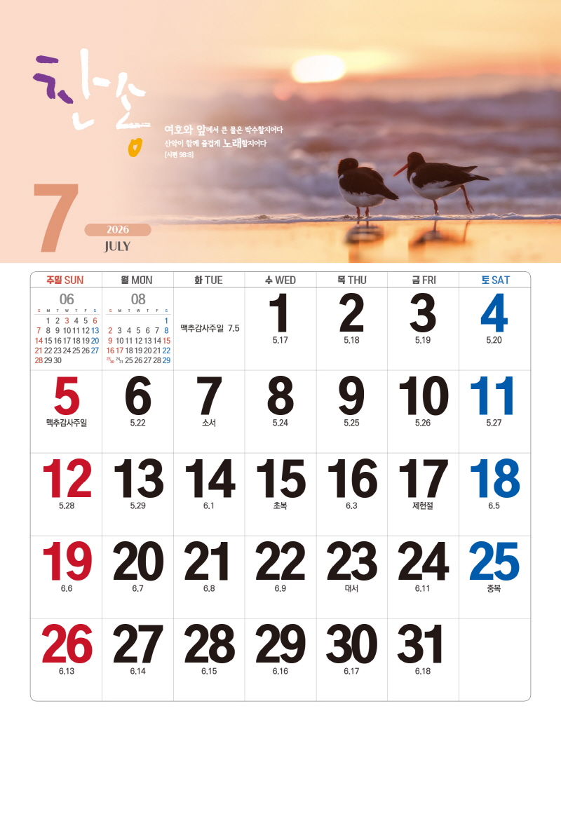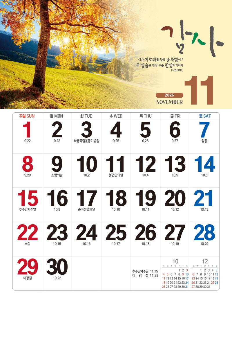 본 캘린더에는 음력, 절후, 교회력이 표기되어 있습니다.