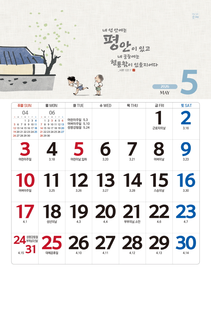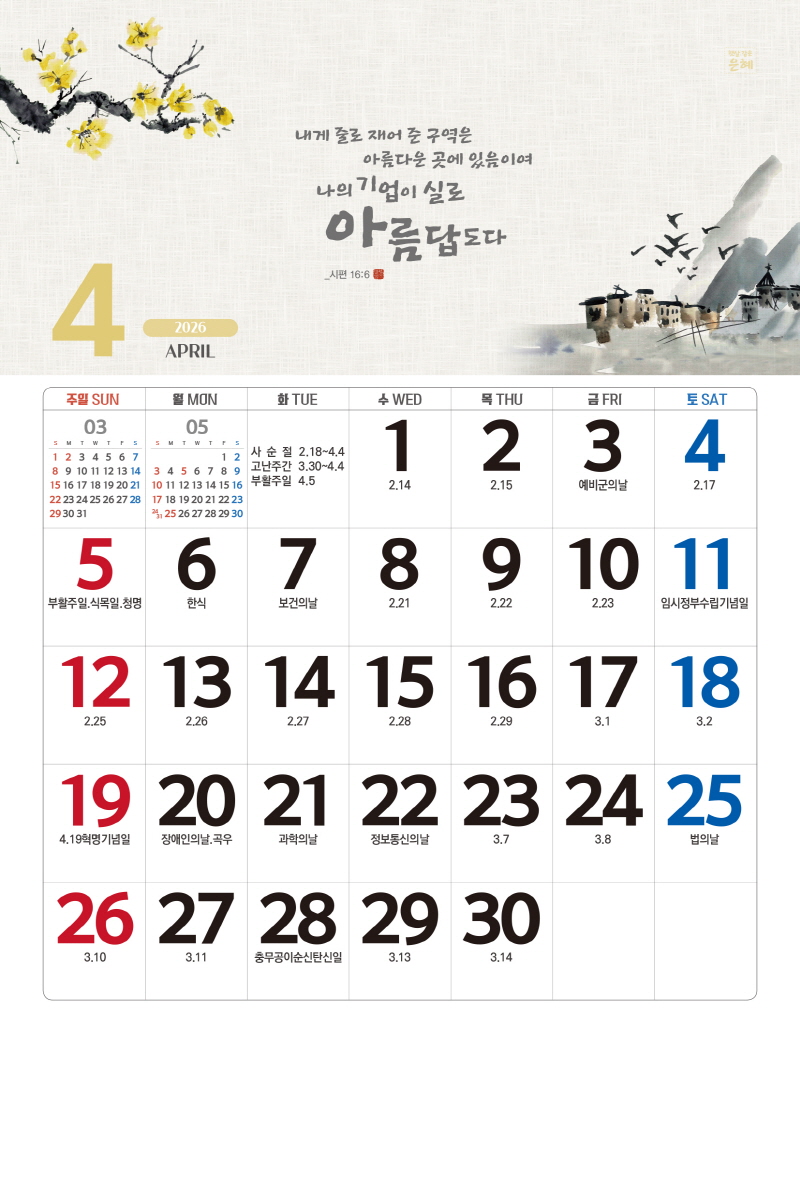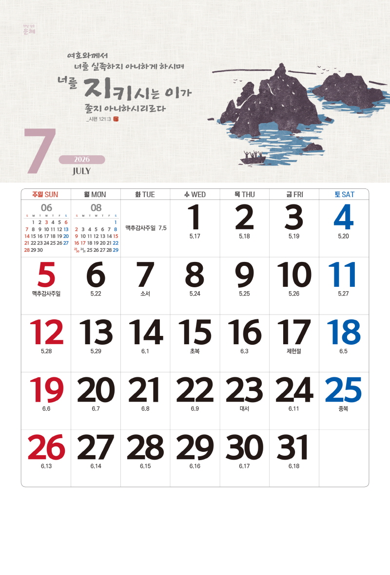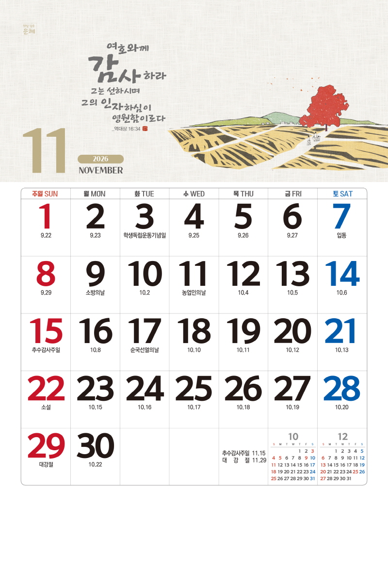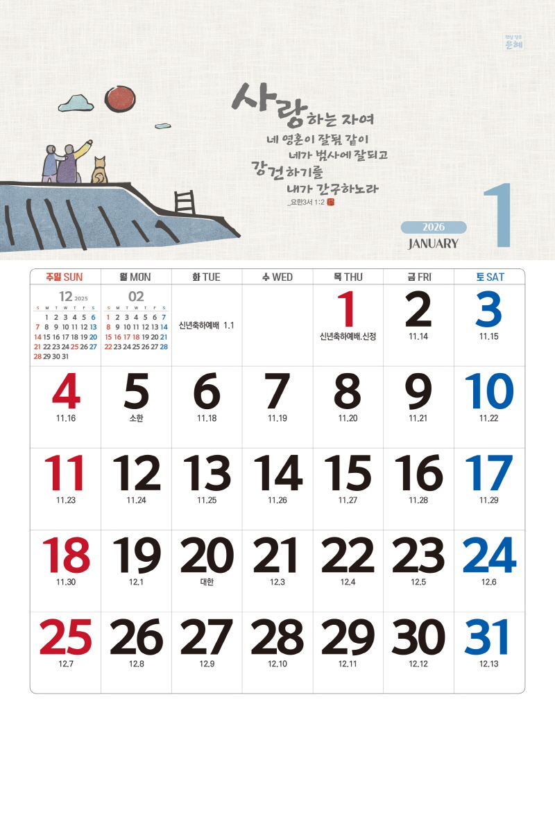 본 캘린더에는 음력, 절후, 교회력이 표기되어 있습니다.