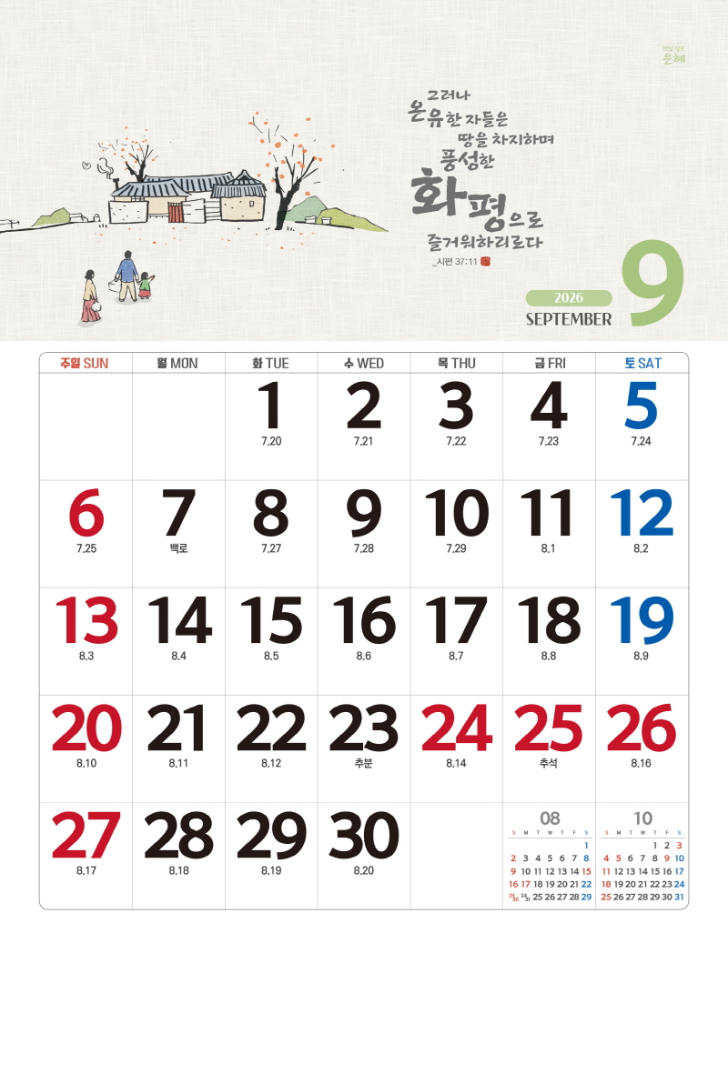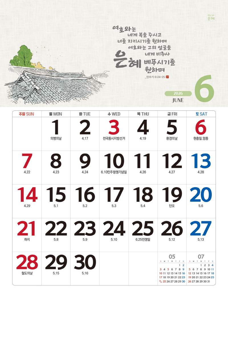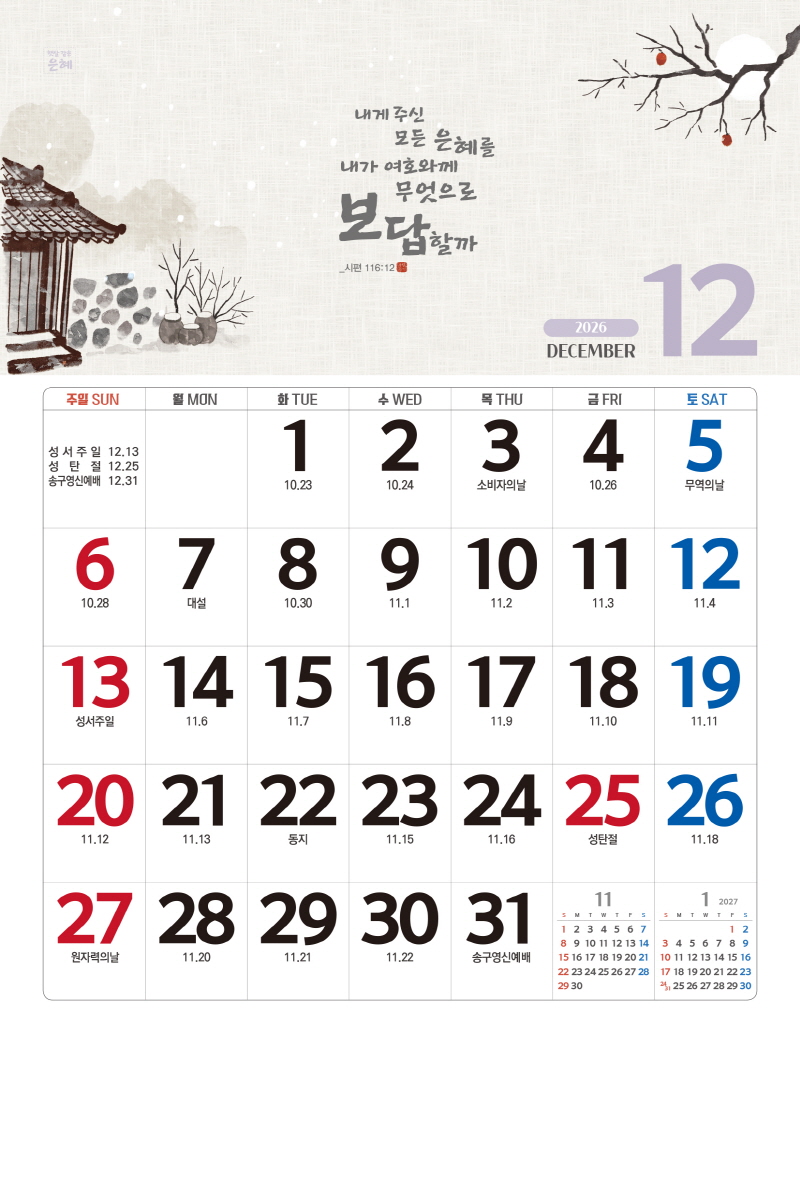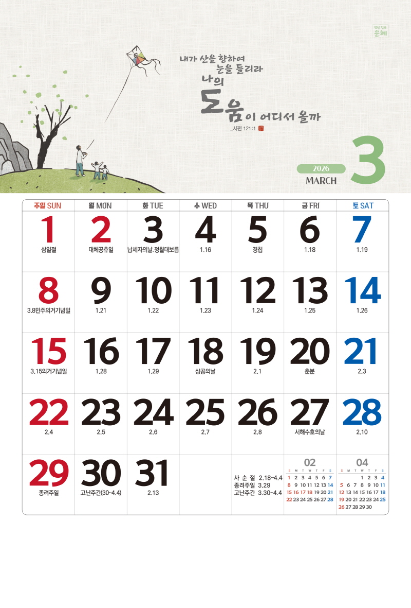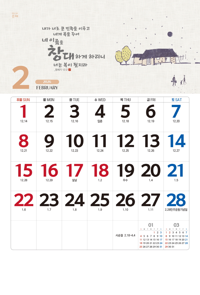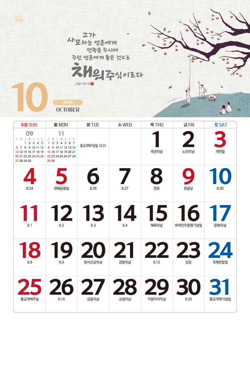 본 캘린더에는 음력, 절후, 교회력이 표기되어 있습니다.