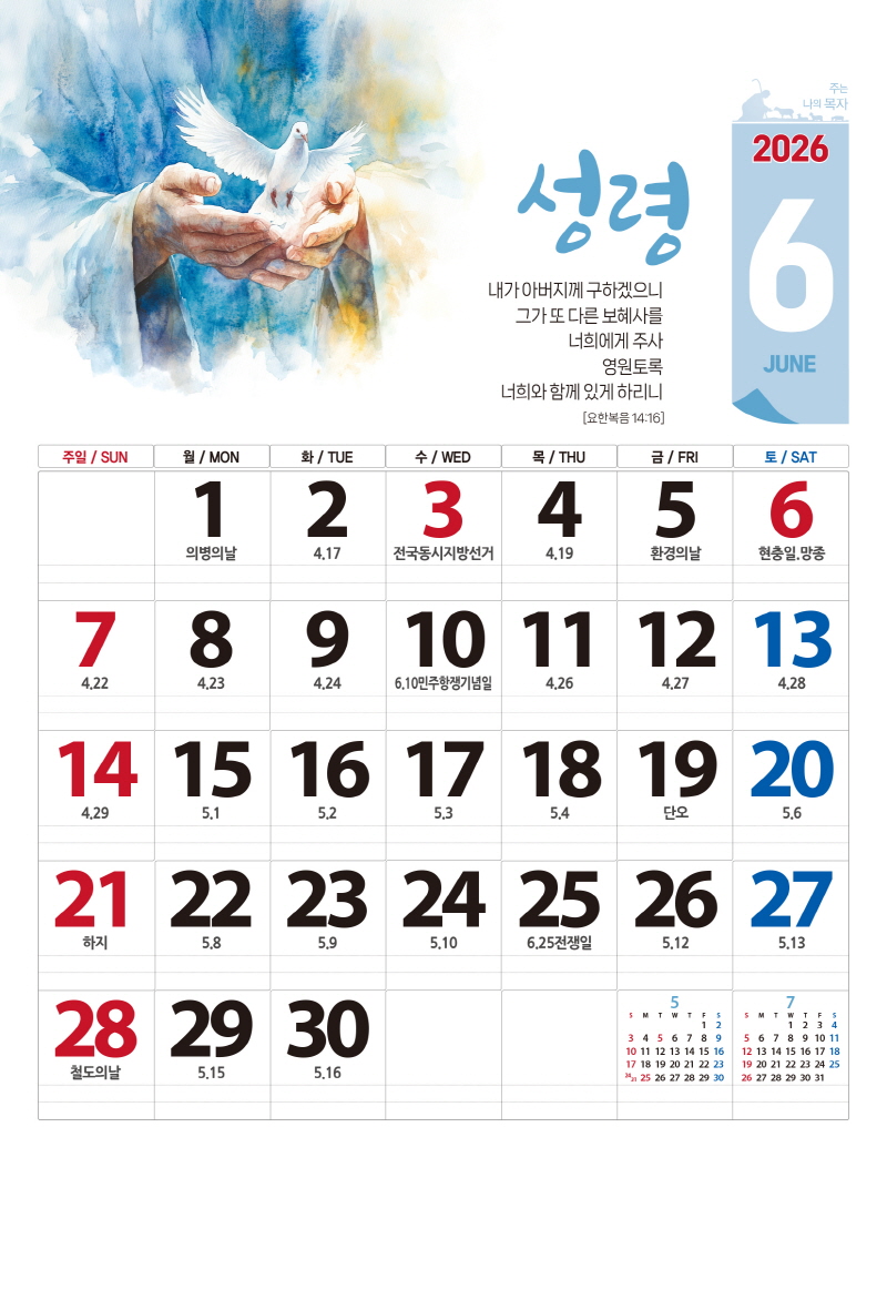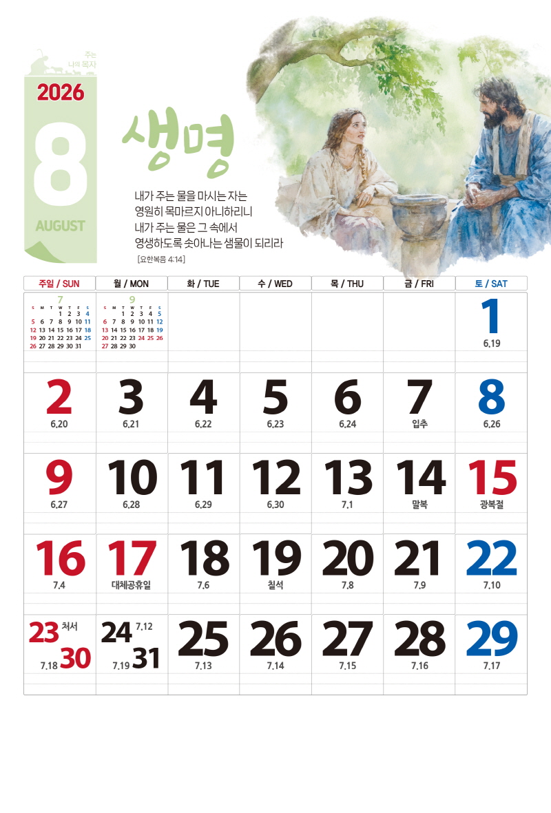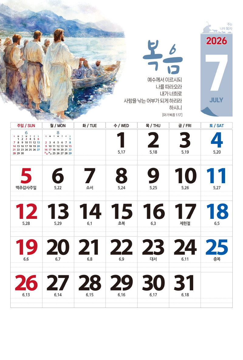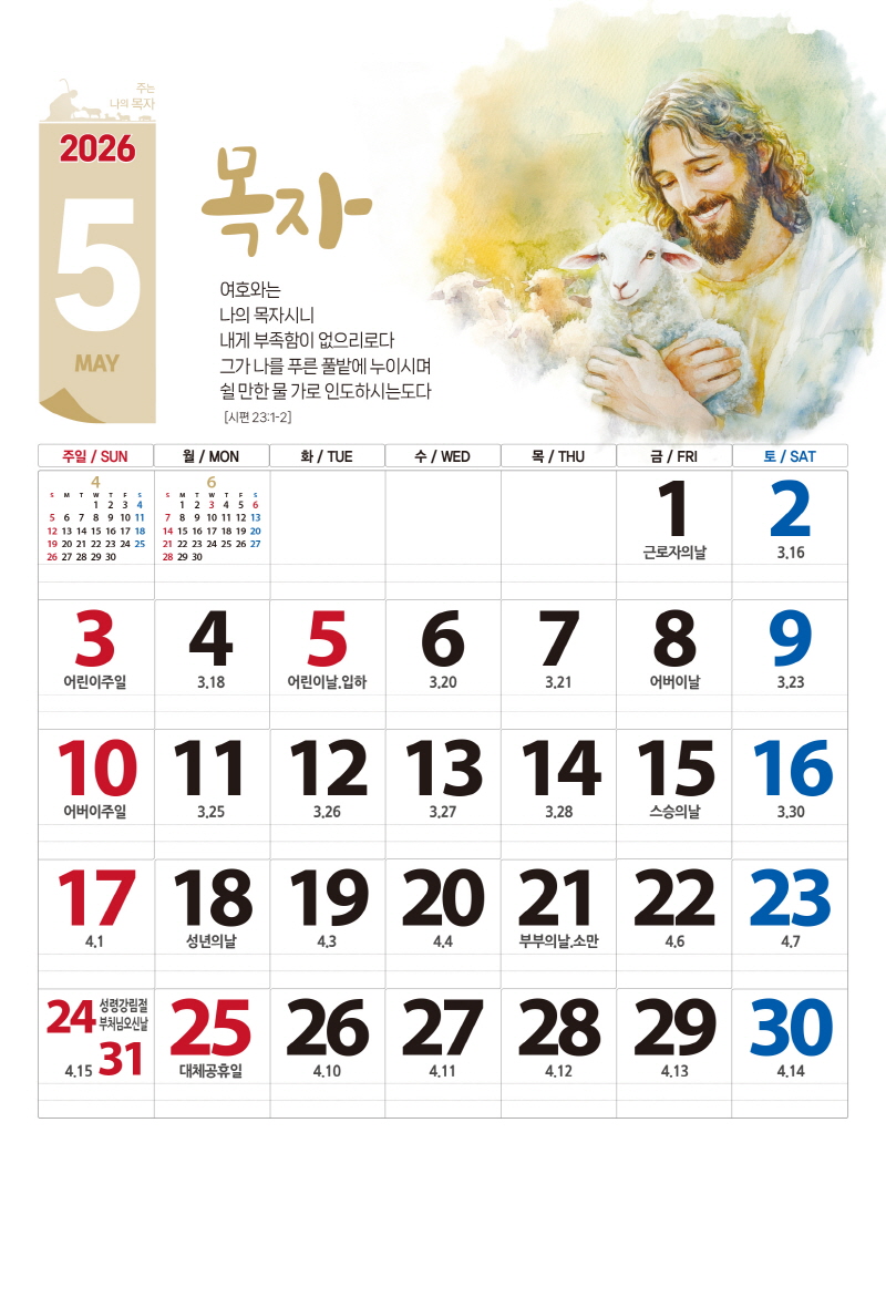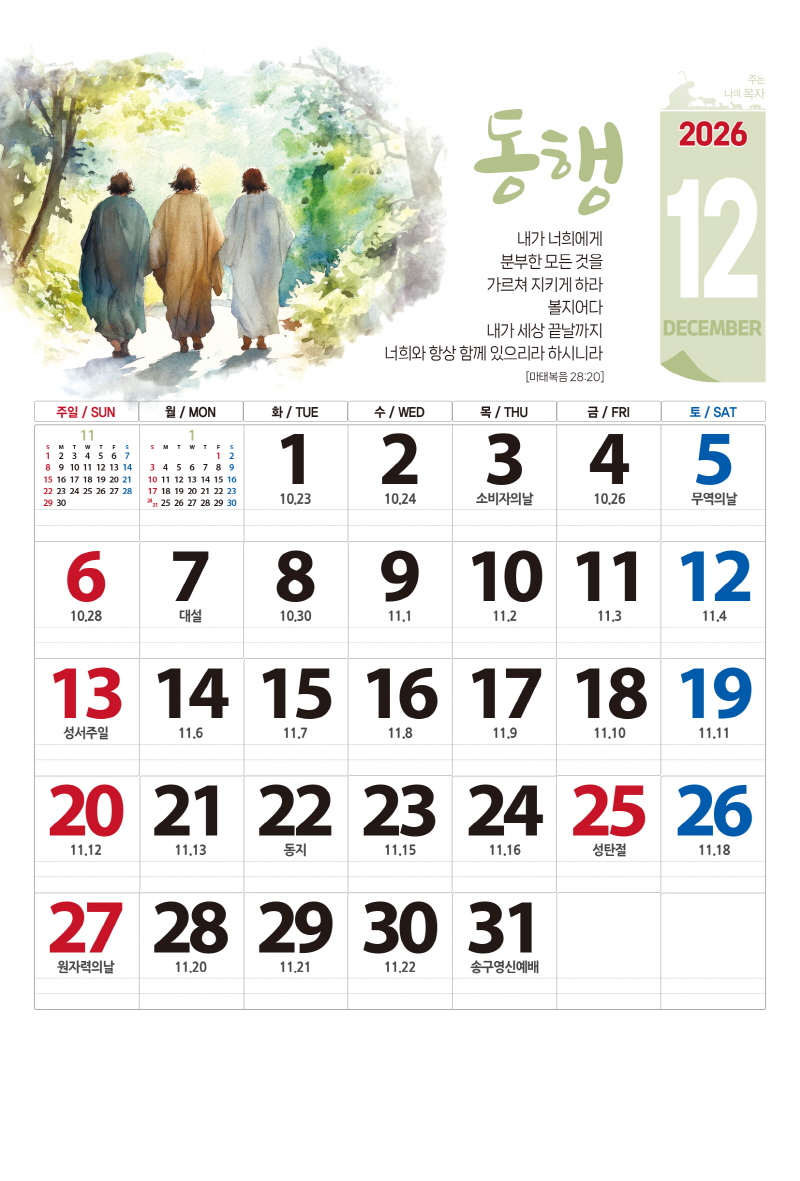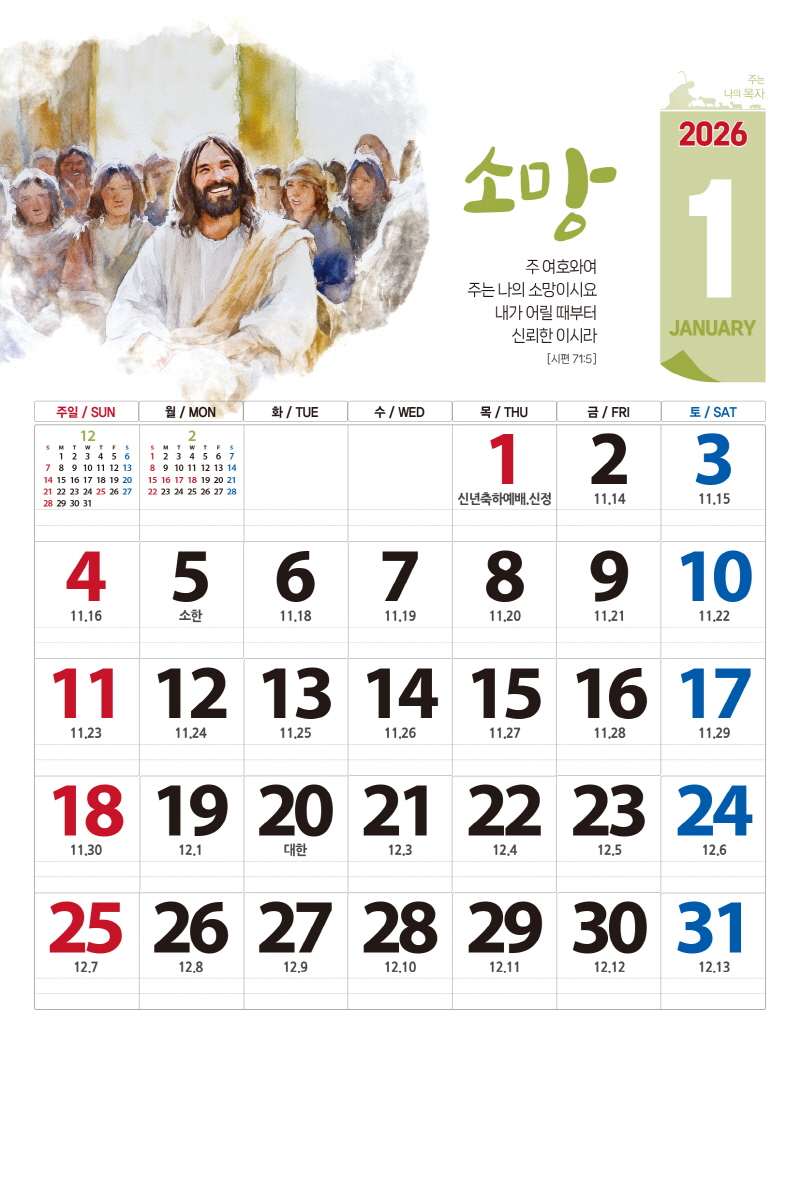 본 캘린더에는 음력, 절후, 교회력이 표기되어 있습니다.