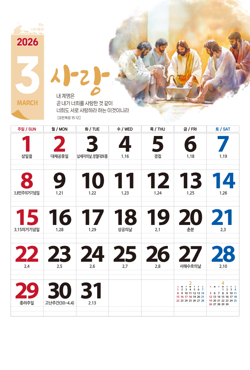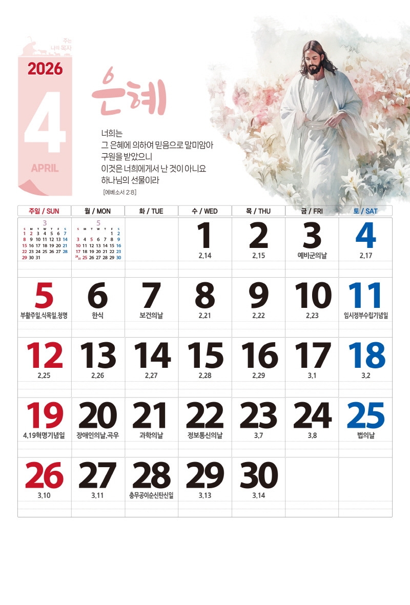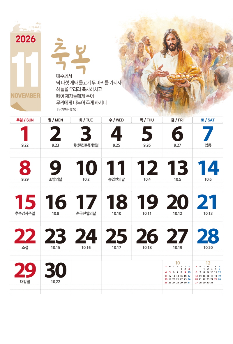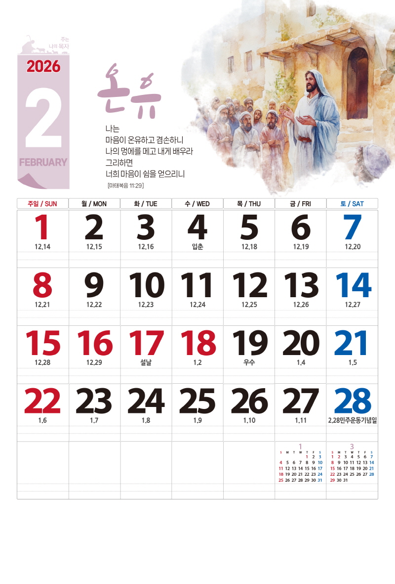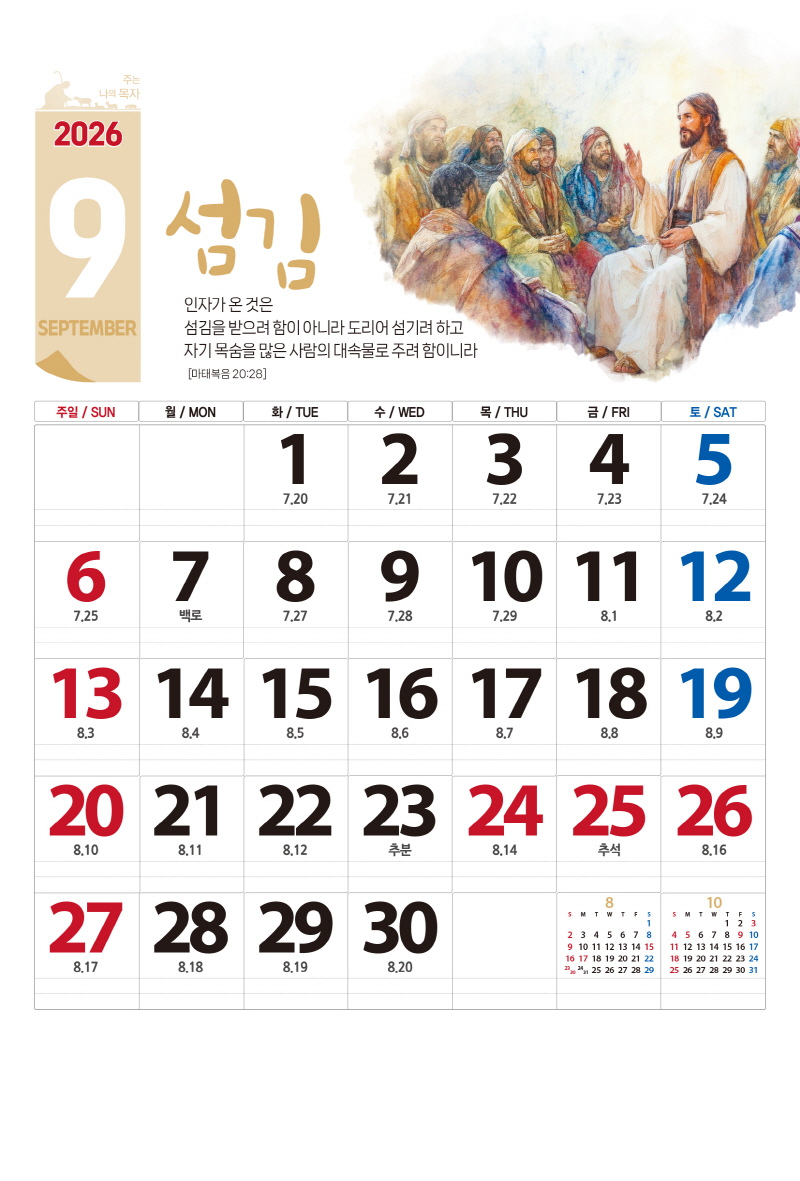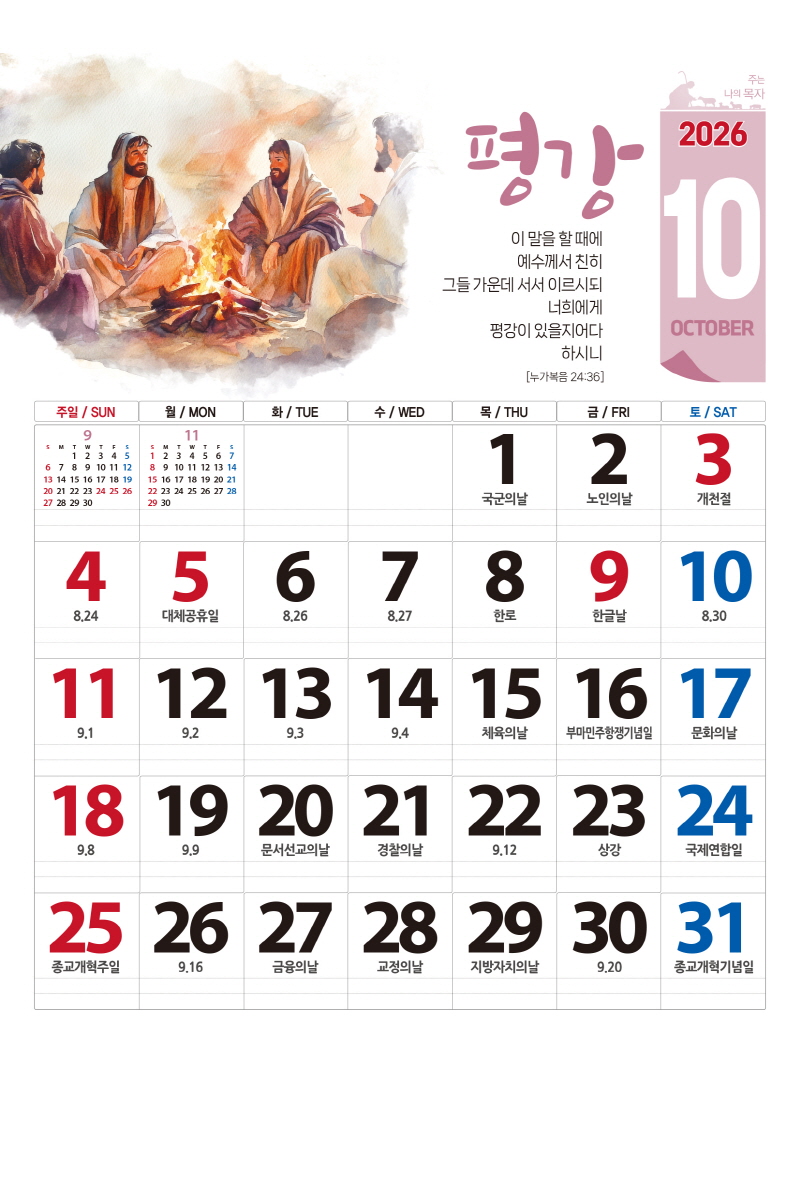 본 캘린더에는 음력, 절후, 교회력이 표기되어 있습니다.