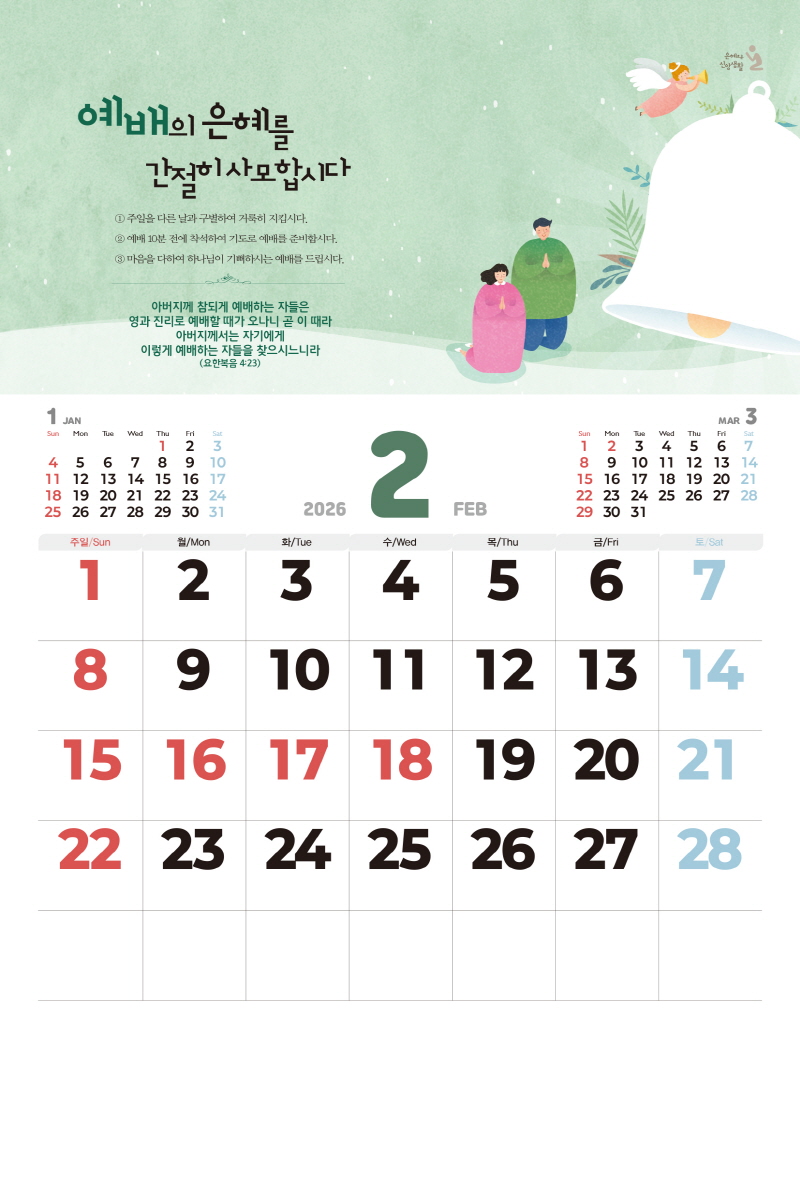 본 캘린더에는 음력, 절후, 교회력이 표기되어 있습니다.