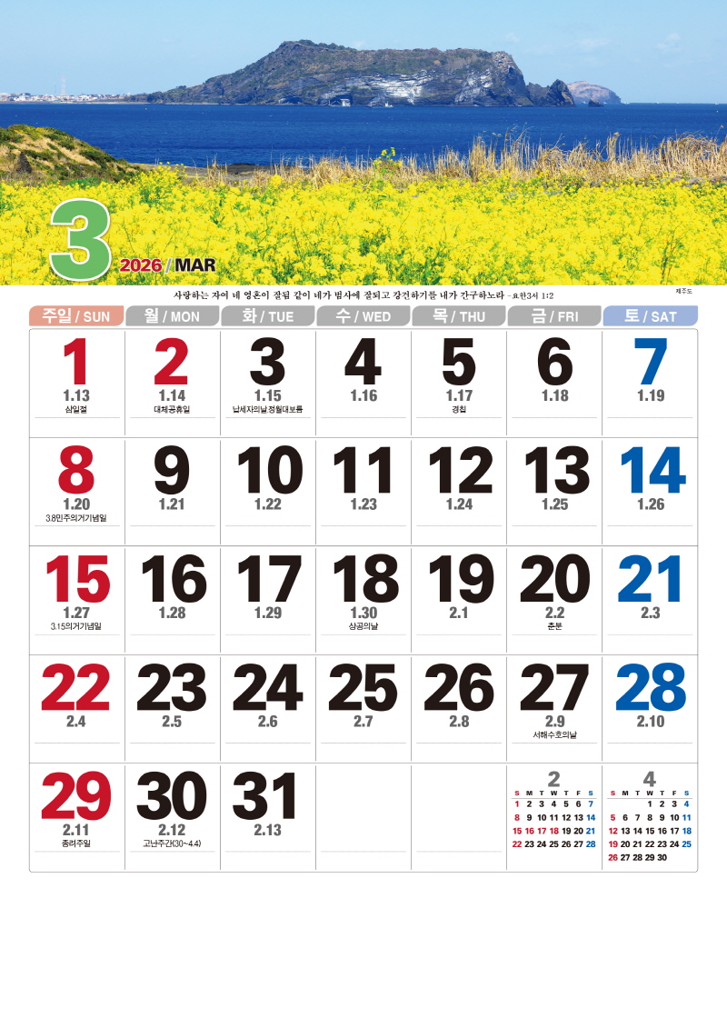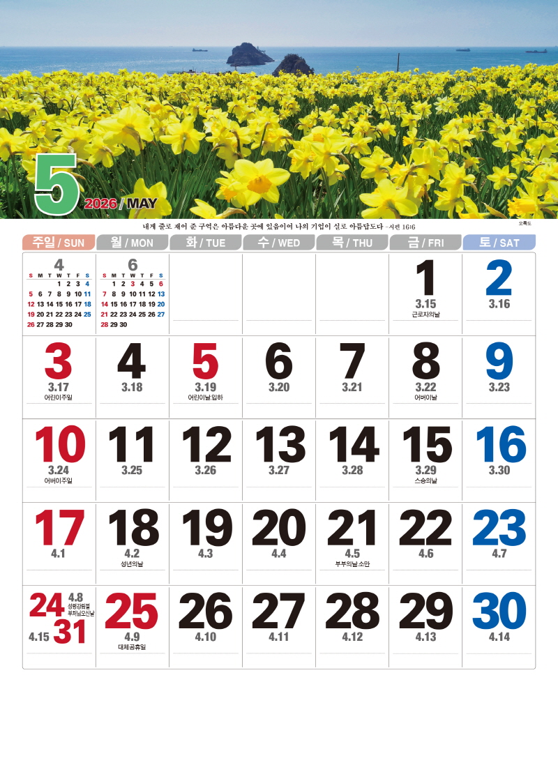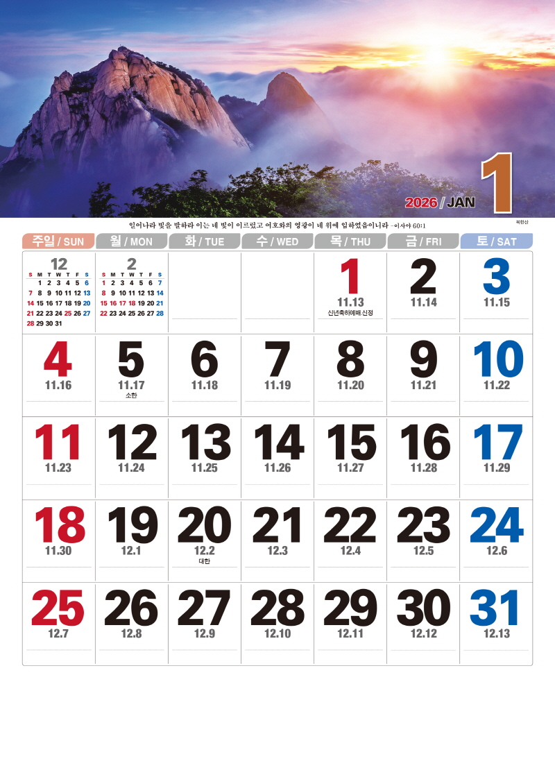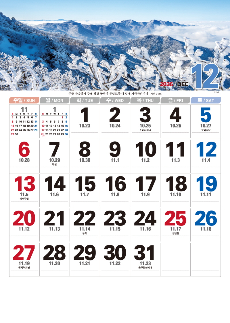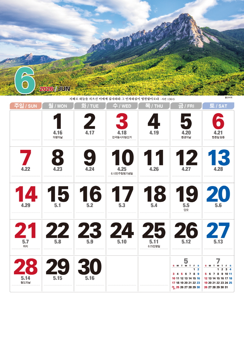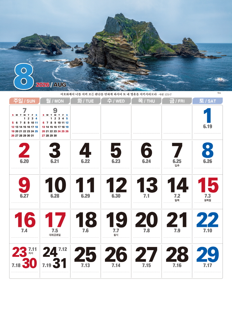 본 캘린더에는 음력, 절후, 교회력이 표기되어 있습니다.