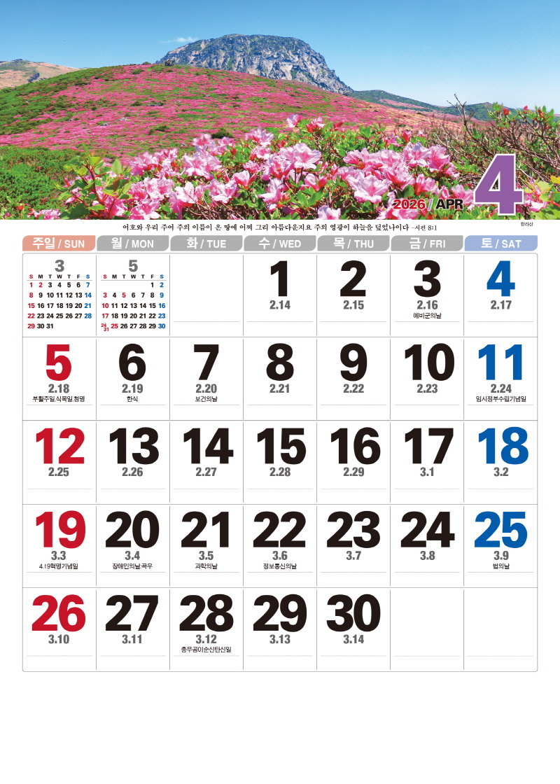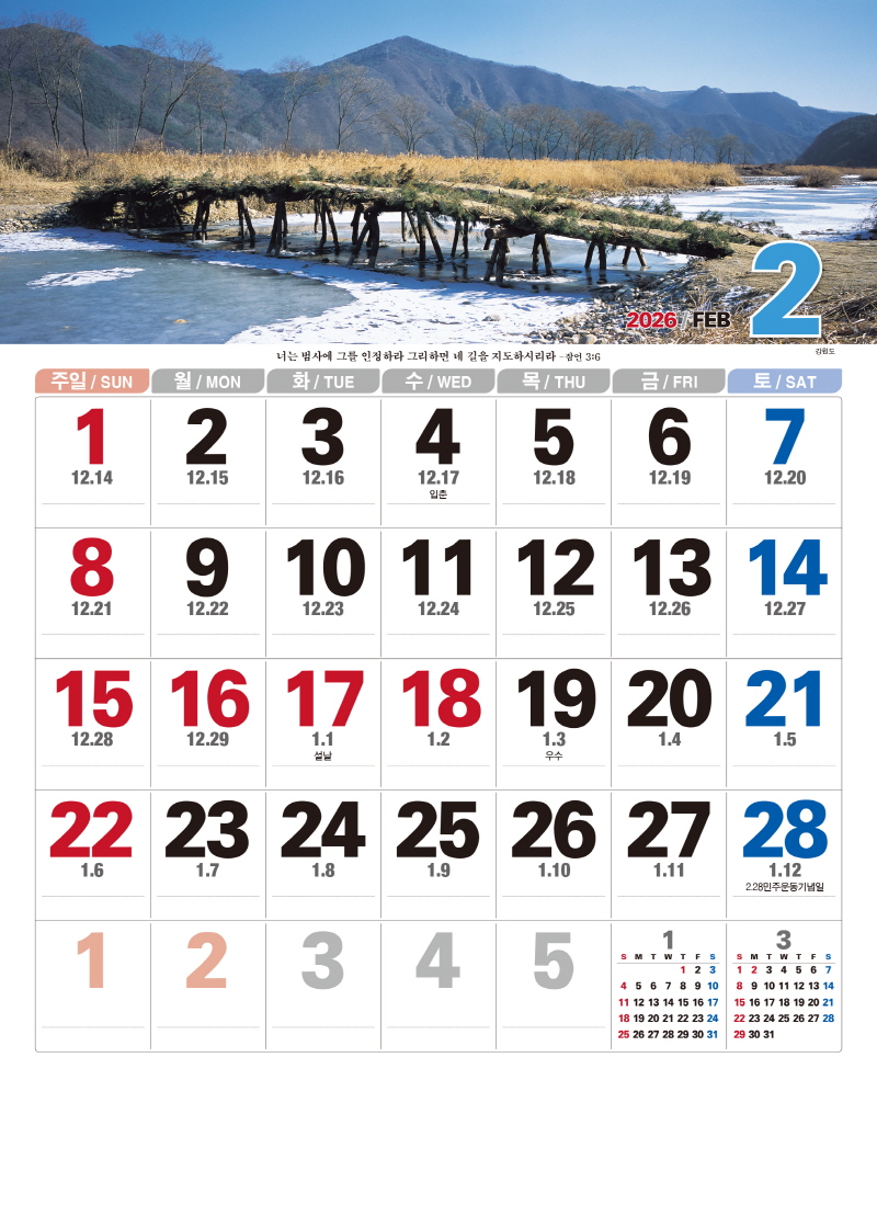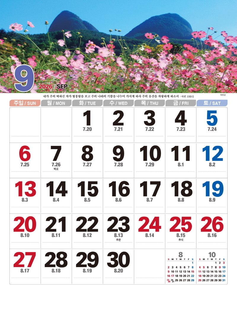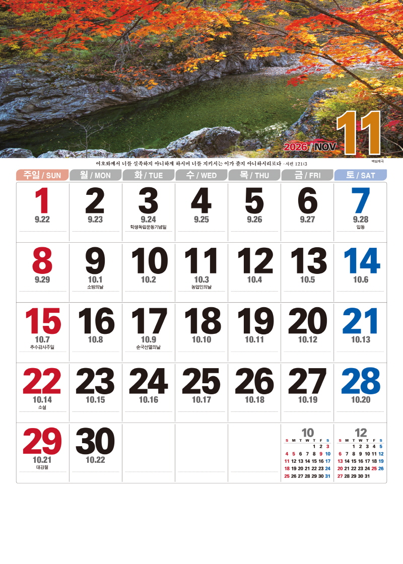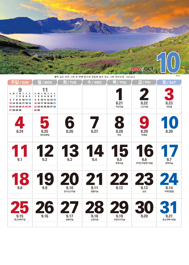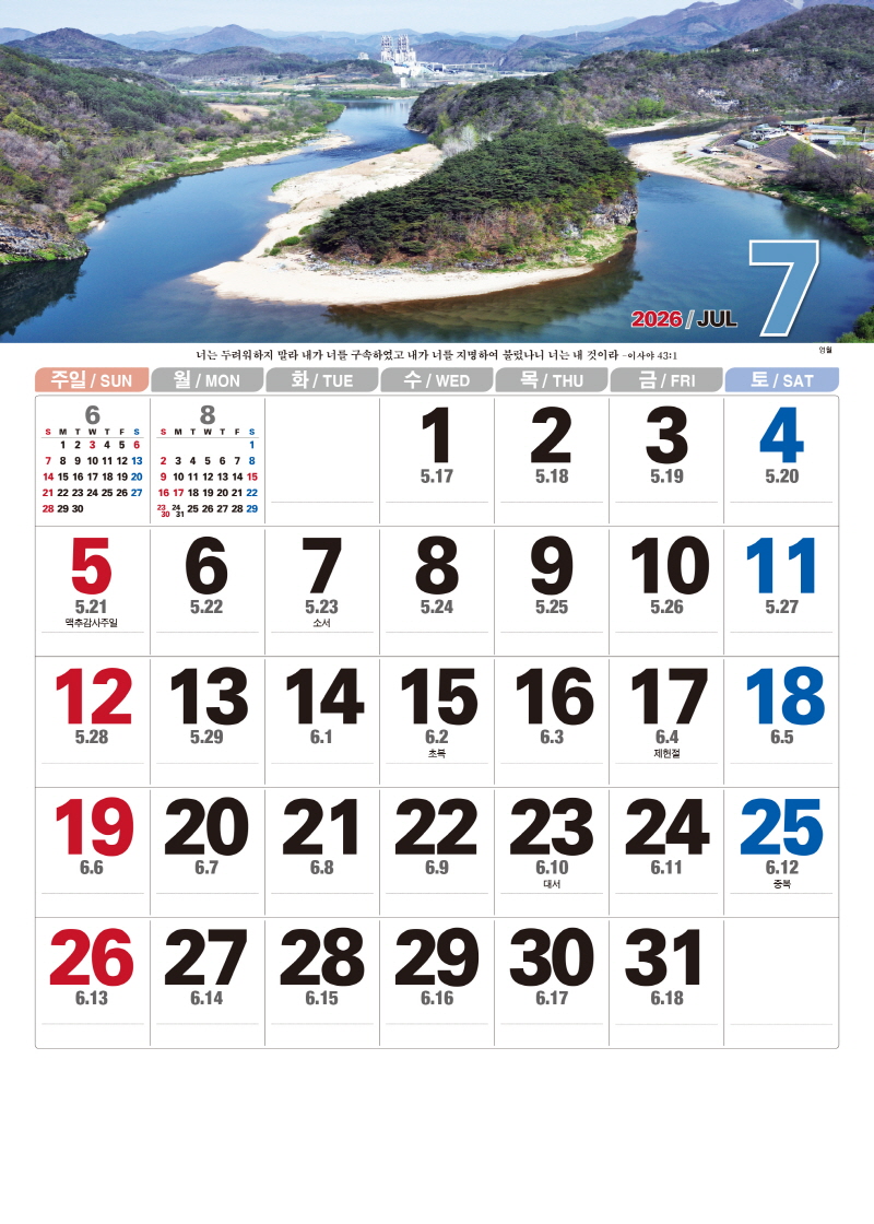본 캘린더에는 음력, 절후, 교회력이 표기되어 있습니다.